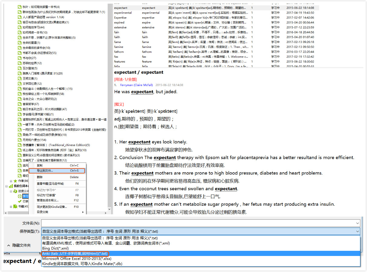 选择完毕之后即可进行导出操作:「选中生词本中的学习中的部分 - 单击右键 - 导出到文件 - 选择带有逗号的 txt 并任意命名 - 保存」。当然最后一步也很重要,记得要选择带有 Anki 前缀的 .txt 格式导出,具体可见下图: