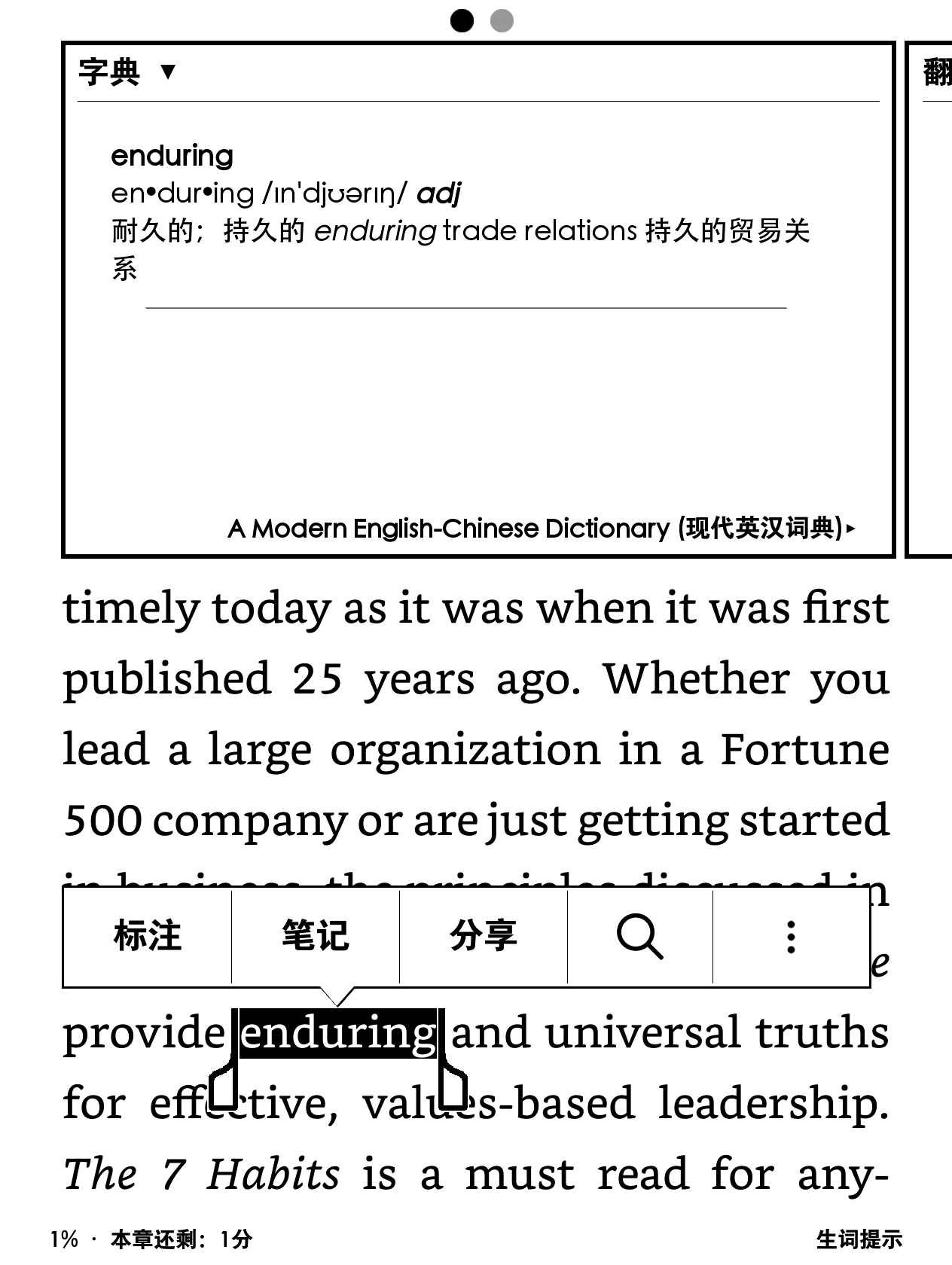 上图所展示的单词释义是由 Kindle 内置词典提供的,目前 Kindle 内置词典有现代汉英词典以及现代汉语词典两种,分别应用于英语学习和汉语学习。(希望 Kindle 后续能提供更多的优质词典供用户选择)