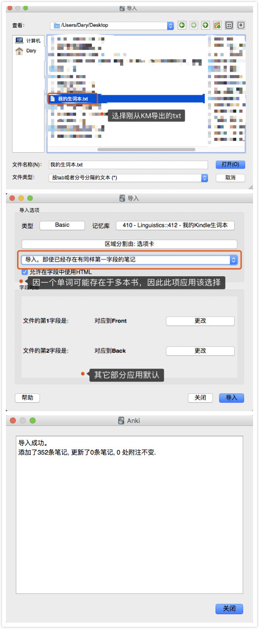 在 Kindle Mate 将文件以 Anki 可识别的格式导出后,我们就到了在 Anki 中导入 Kindle 生词本的环节。你只需要采用以下几个步骤即可完成操作:「文件 - 导入- 选择KM导出的 .txt - 填写导入信息- 导入」。当然这中间会有一些需要注意的信息,我已在下图标出: