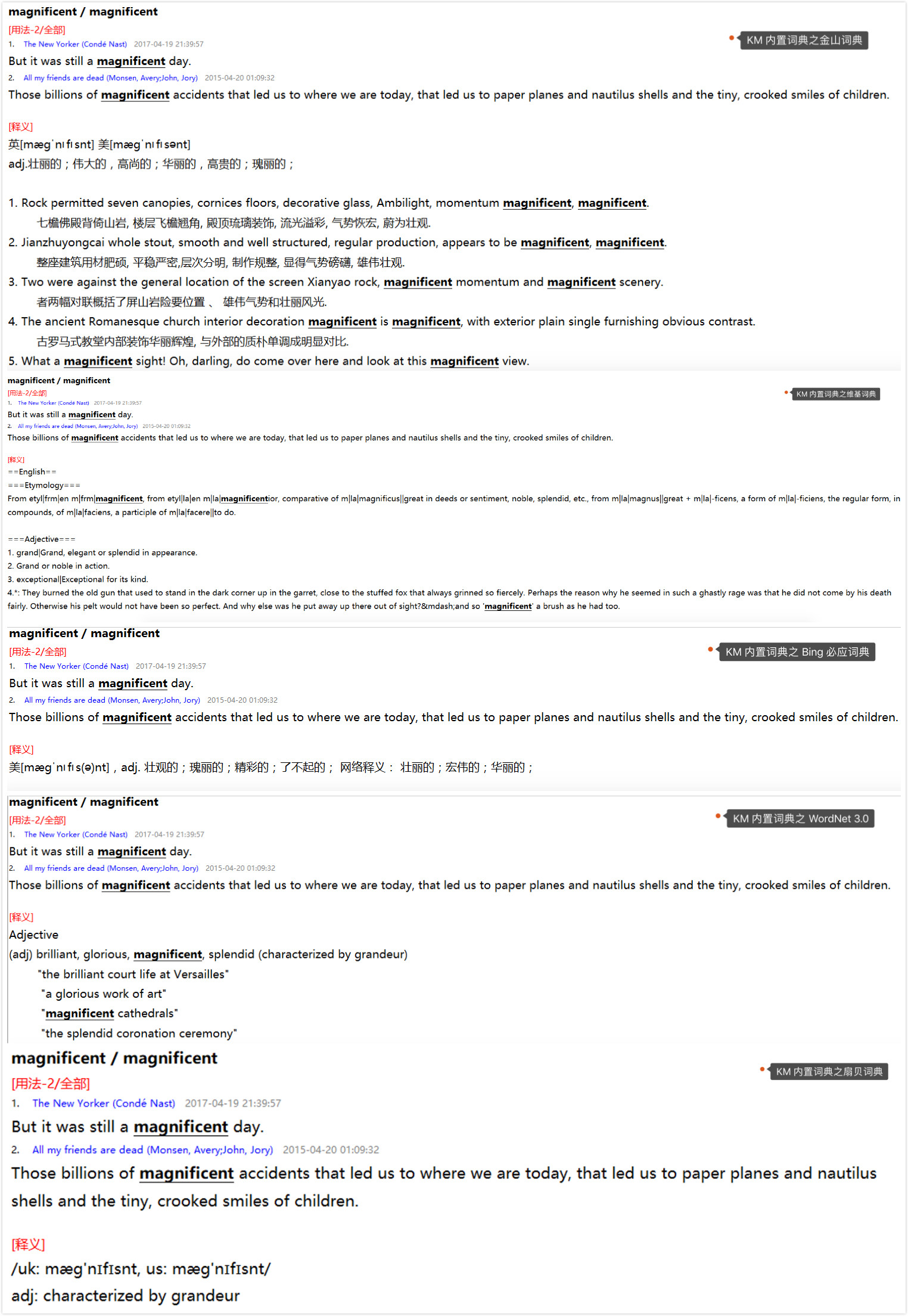 通过这个流程我们可以了解到,释义一次只能选一个,这样的话,我们就会面临应该选择哪个词典的问题。下面我会就单词「Magnificent」来对比一下这五个词典: