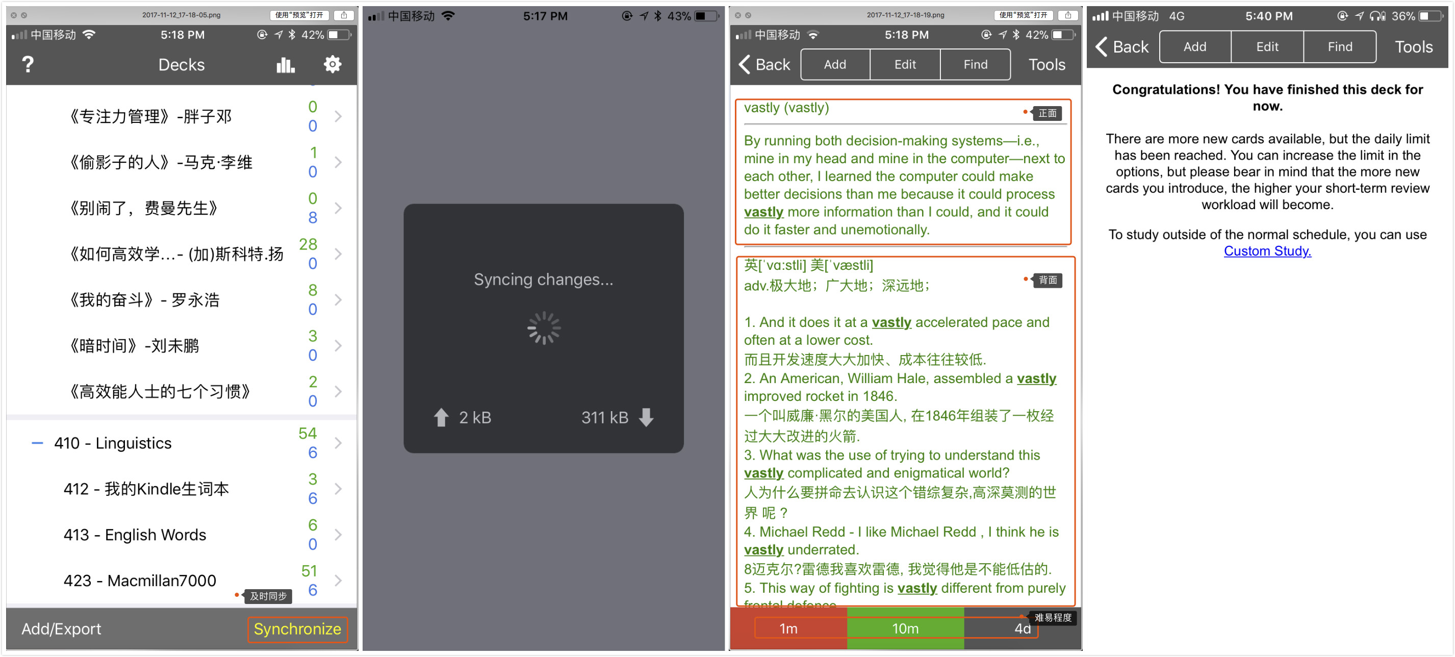 在生词本导入完成之后,就到了最后的记忆部分了。本质上来说,这部分就是从 PC 端转到移动端的过程,通过我们的手机同步了 AnkiWeb 事先准备的优质生词本信息之后,我们可以利用平时碎片化的时间对它们进行记忆、反刍,通过结合原文加深了我们对书的理解;遇到实在不理解的地方,我们还可以返回书中重读,没准还能提炼出更多优质的信息,如此反复,书才能读透,作者的思路才能理解得更深入。