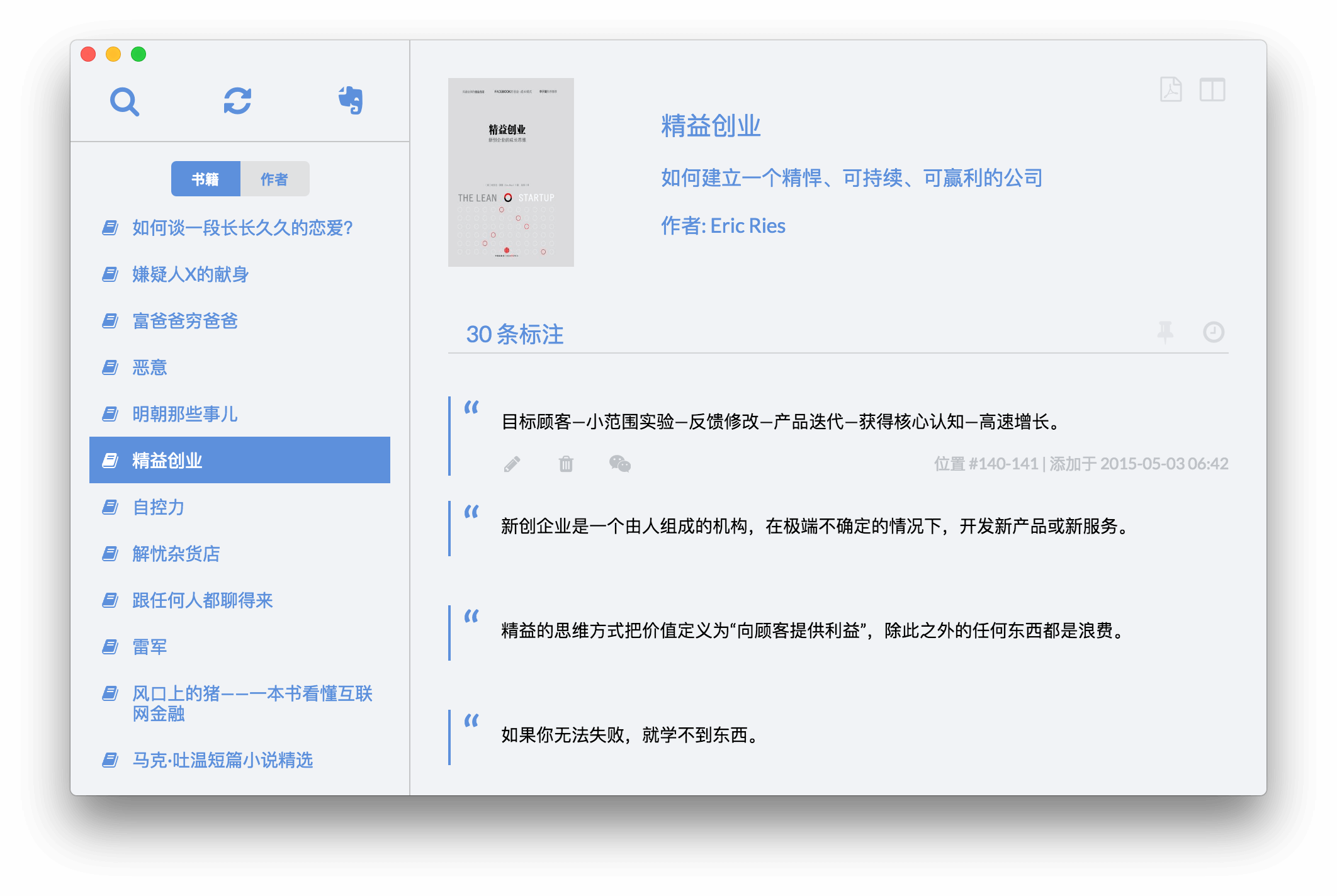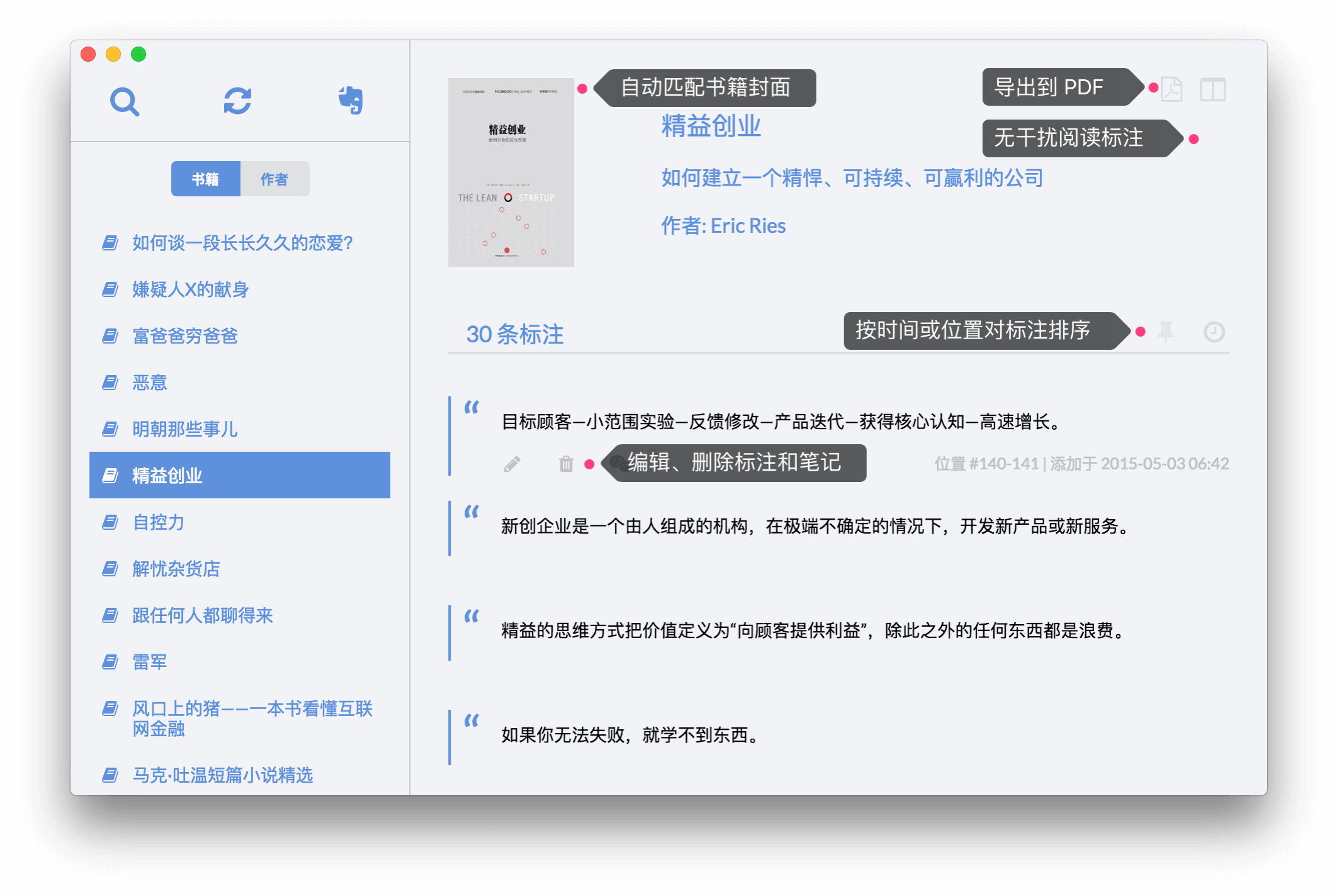 Knotes 售价 35 元,可免费试用 7 天,你可以前往 官网下载。 Klib 是目前导入功能最强的标注管理工具,不过只支持 Mac 平台。Klib 支持从 Kindle 设备、亚马逊服务器、Kindle app 、iBooks 甚至多看系统导入标注或笔记。它除了拥有上面介绍的三个 Knotes 的功能点之外,还可以通过回顾文章上下文还原语境,方便你对书的内容进行更深度的学习。