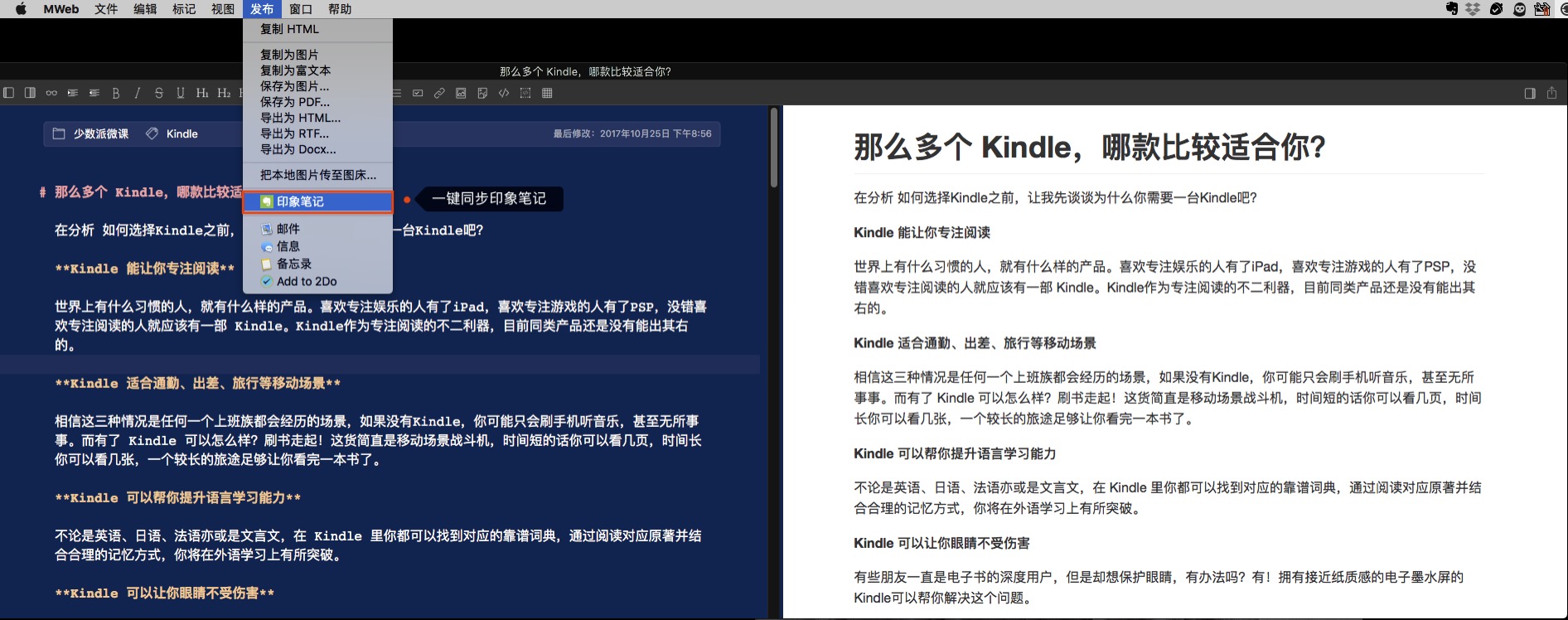 MWeb 是一款非常好用的国产写作工具,支持导出 Markdown 和同步回印象笔记。目前从各端体验来看,在桌面端体验最佳。所以如果你还没有一款自己喜欢又趁手的 Markdown 工具,不妨试试用 MWeb 进行写作输出。