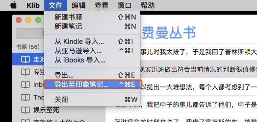 Klib 在这三者中操作最为简单,直接导出到印象笔记即可,还支持增量同步,具体操作如下:「选中右上角文件选项」→「导出至印象笔记」,入下图所示: