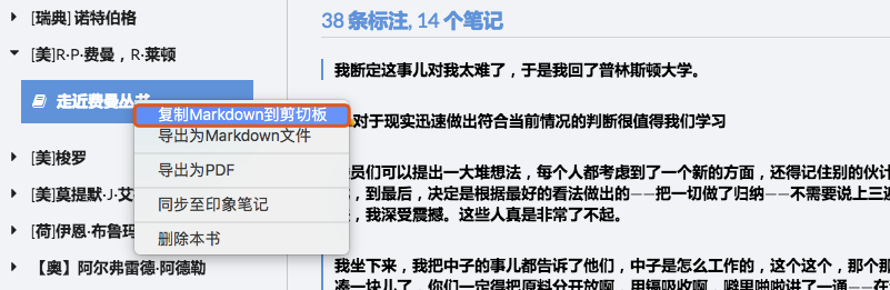 Knotes 可以直接同步标注到印象笔记,但是需要进行预设设计,这个预设设计如果是面对比较多的标注时可能没有想象中的那么美观,因此如果你比较介意这点,可以试一下这个办法,使用类似的思路,但是不需要进行多余的导出动作,具体操作:「选中已整理的书目」→「右键复制MD到剪切板」→「粘贴到印象笔记新建的笔记本」,如下图所示: