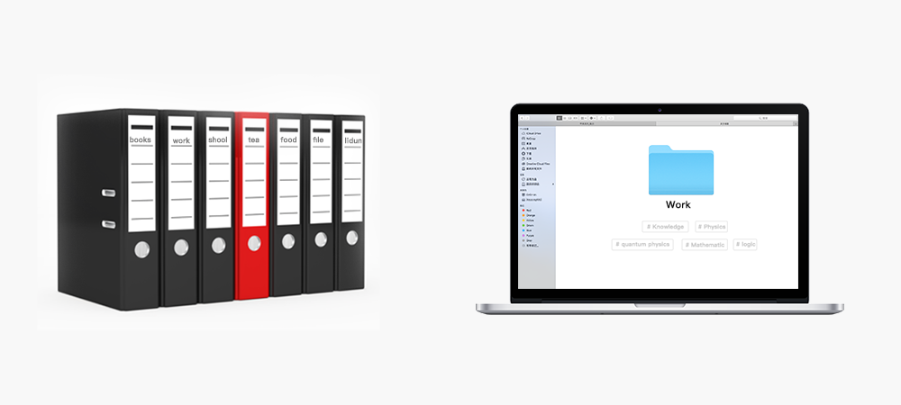 在现实和计算机文件系统中,标签的最大区别在于它是否具有「容器属性」。前者的标签只能贴在文件上,而后者的标签不仅可以「贴」,也可以用来「装」。