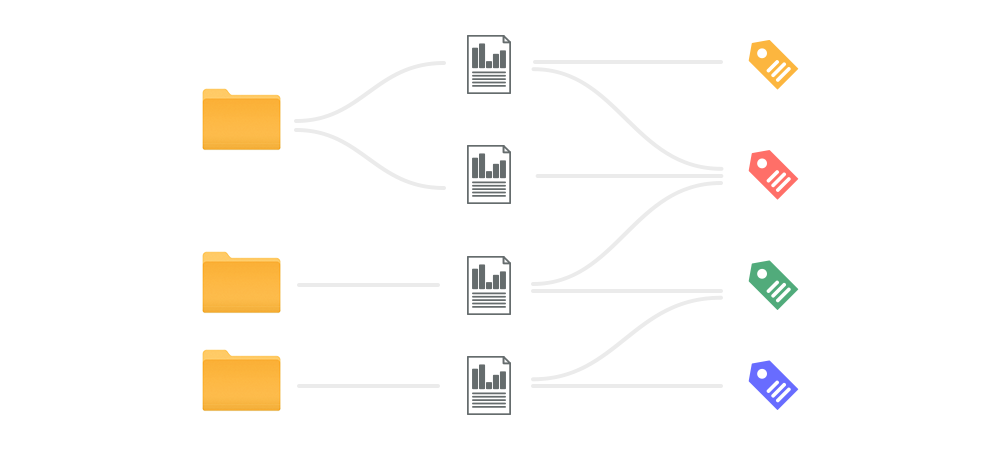 那么这时候标签和文件夹的区别,就在于「排他性」,或者说对应关系。文件夹与文件的对应关系是一对多,同一个文件不能存在于多个文件夹,所以会出现各种分类困难与纠结。但标签不会有这种问题,你认为这个文件具有多个属性,那就可以给它打多个标签。