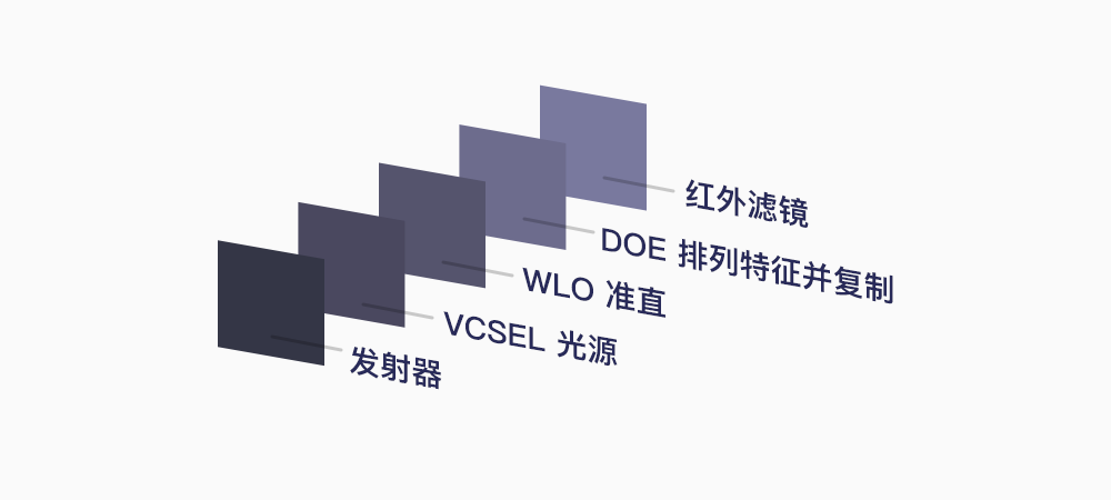 首先,结构光发射器中的 VCSEL 是负责发出红外光源的生成器,之后,光线通过 6 层的 Wafer Level Optical,它其实是一种准直镜头,通过光的折射增强光的激光特性,即从发散的光源变为收束性较强的平行光。这时候的光,依然没有前面提到的排列特征,这时候需要通过 Diffractive Optical Element,将光变成具有某种排列特征的点或线光源,并通过进一步的衍射,复制扩大这个具有排列特征的结构光。最后,通过一层红外光滤镜,过滤出特定波长的红外光,这时候的结构光就彻底生成了。