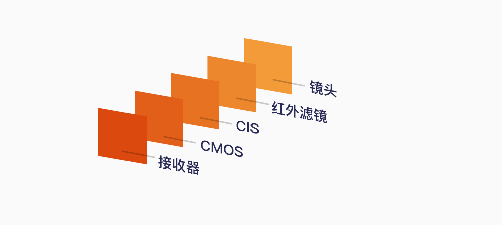 而结构光的接收器相对就比较简单了。你可以把它理解成,专门用来拍红外光照片的摄像头。和传统摄像头的构造几乎一样,它有红外镜头、140 万像素的感光元件。和发射器一样,为了排除环境中的干扰光,所有进入的光线,都必须经过红外光滤镜,只有特定波长的红外波才能进入镜头成像。