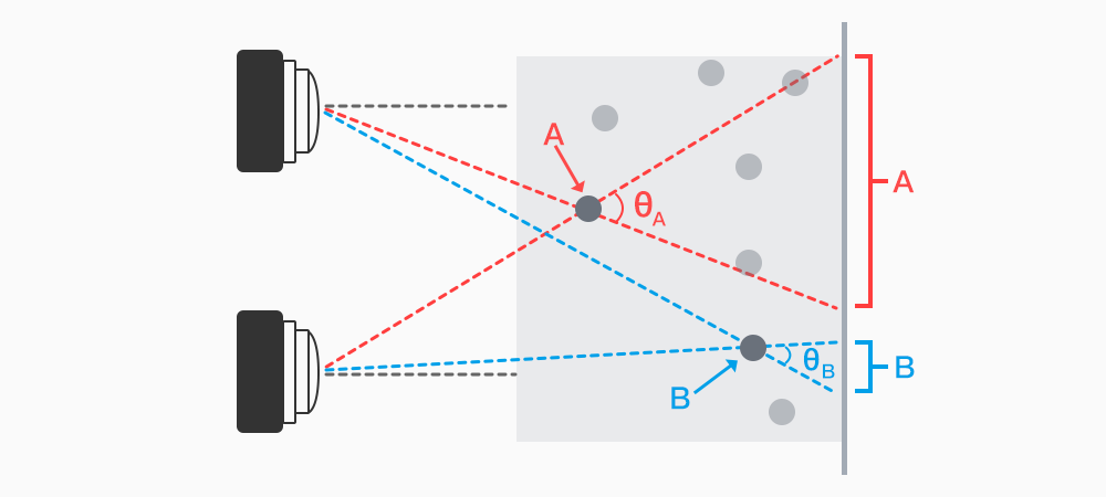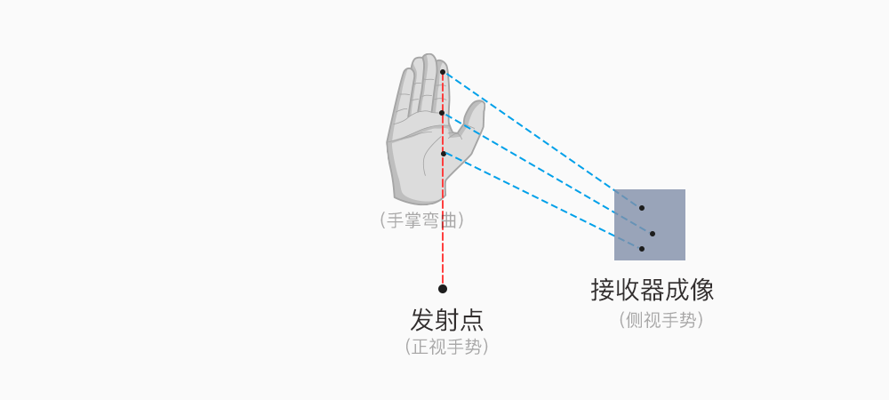 前面说了,结构光传感器主要由发射器和接收器两个部分组成。一个在最左边,一个在最右边,这么排布是有原因的。回想一下我们刚才的例子,观察者想要看到光线发生明显的形变,要从比较侧面的一个位置观察,形变会比较明显。
