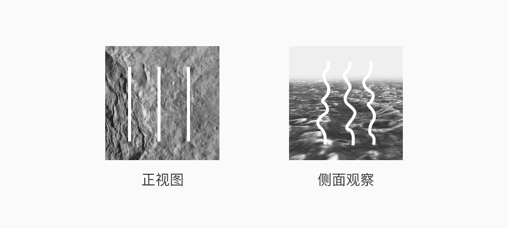 知道什么是结构光以后,其实如何通过它来得到探测物的距离,原理上和前一种「双摄像头」的方案是类似的,都是通过位移。结构光发射器把具有某种排列特征的光照射到物体上后,结构光接收器得到的光,会产生形变,通过分析这种形变,就能得到深度信息。想像一下,你(结构光发射器)在凹凸不平的地面上,贴上三条间距相等的白带,你站在正对面看时,会觉得这是三条笔直的线段,然而如果你移动到侧面观察(结构光接收器),三条笔直的线段,在凹凸不平的平面上,就变成了波澜起伏的曲线。