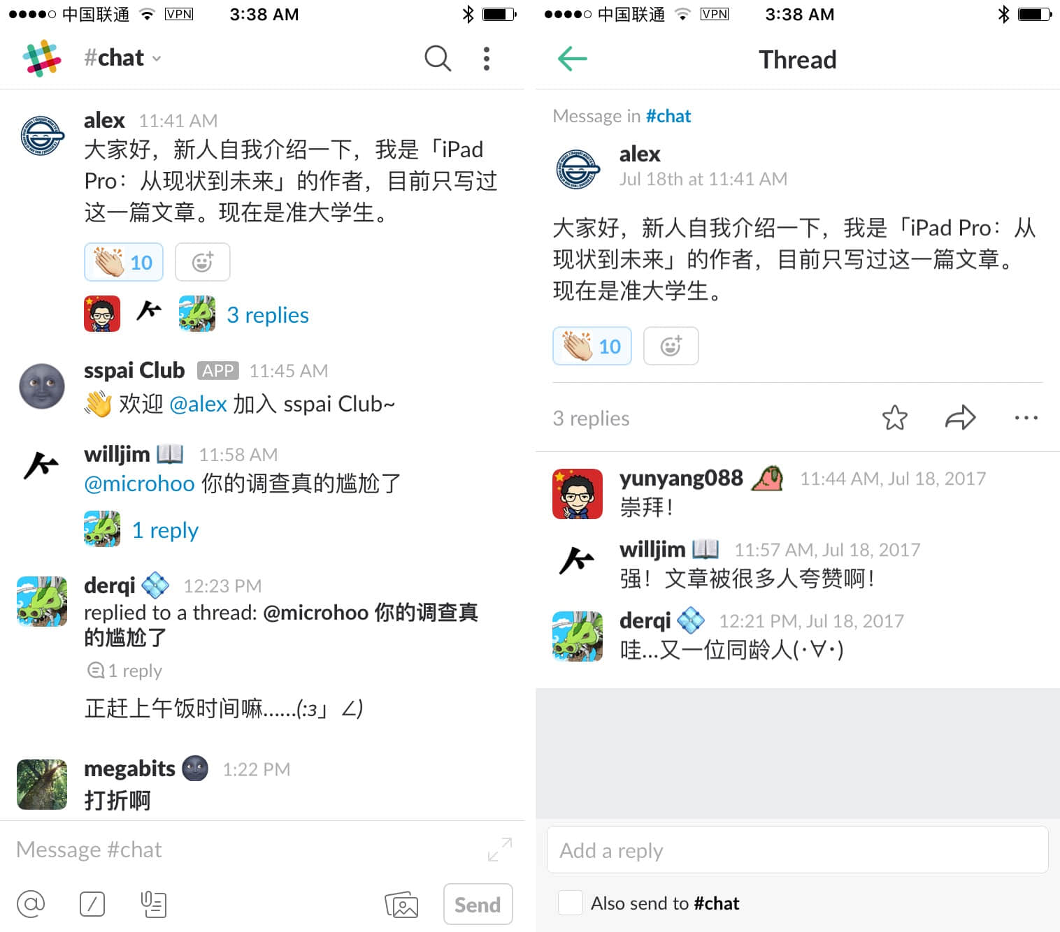 所以 Thread 这个功能,在我所在的 3 个 Team 的实际使用中,利用率都很低而且效果不好。也许有的团队里的成员都非常自律,把这个功能用得非常标准,但我想这不会是普遍现象,这样做反而就又把 Slack 的实时对话的时间流性质给放弃了。