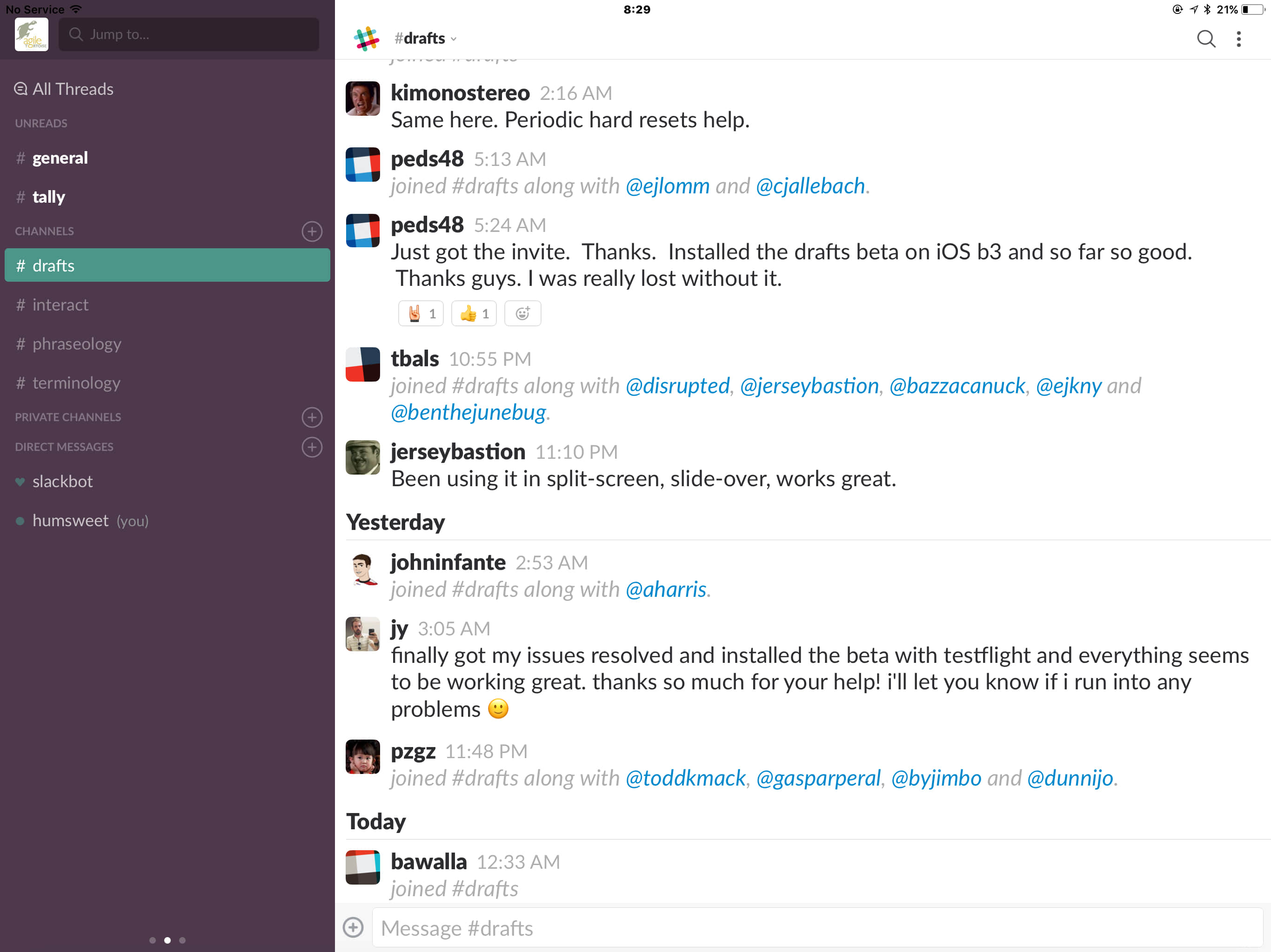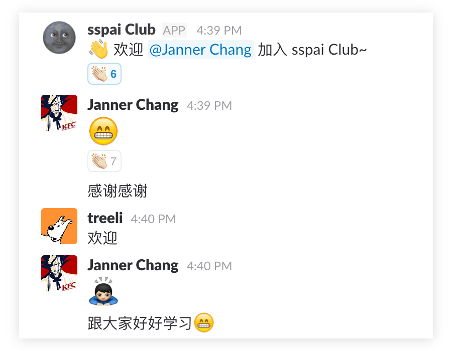 根据这些特征,除了团队使用以外,Slack 也被一些独立开发者和小团队用来运营用户。比如 Drafts 的开发者 @Agiletortoise,他在 App Store 上架了 5 款应用,于是他在他的 Slack 里给这些应用分别建立了一个频道,用于发布相关消息,比如开发进度或者新的 TestFlight 版本提交。因为在个人社交账户,开发者可能想发更多自己的想法,而应用的官方社交账户,开发者也许需要发更正式的内容。 Slack 的特性给运营用户提供了各种可能,譬如少数派的作者群,关联了 Zapier,做到了一个对新入群的成员自动发送一条欢迎语的功能。这个功能很体贴,可以让新人感到新团体的温度,虽然它是个机器人。