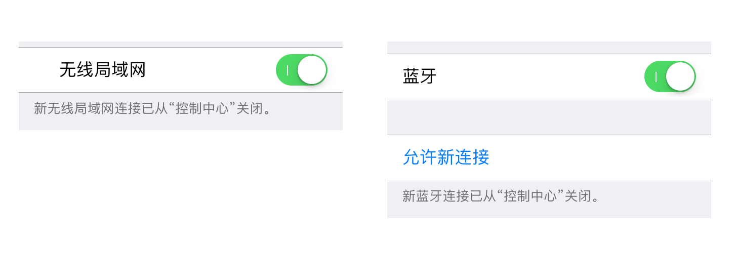来,往上拉出通知中心,关掉 Wi-Fi,再去系统设置里看看——等等,你的 Wi-Fi 是不是仍然显示开启?不仅 Wi-Fi,蓝牙也是如此。什么,控制中心里的 Wi-Fi 和蓝牙关不了了?