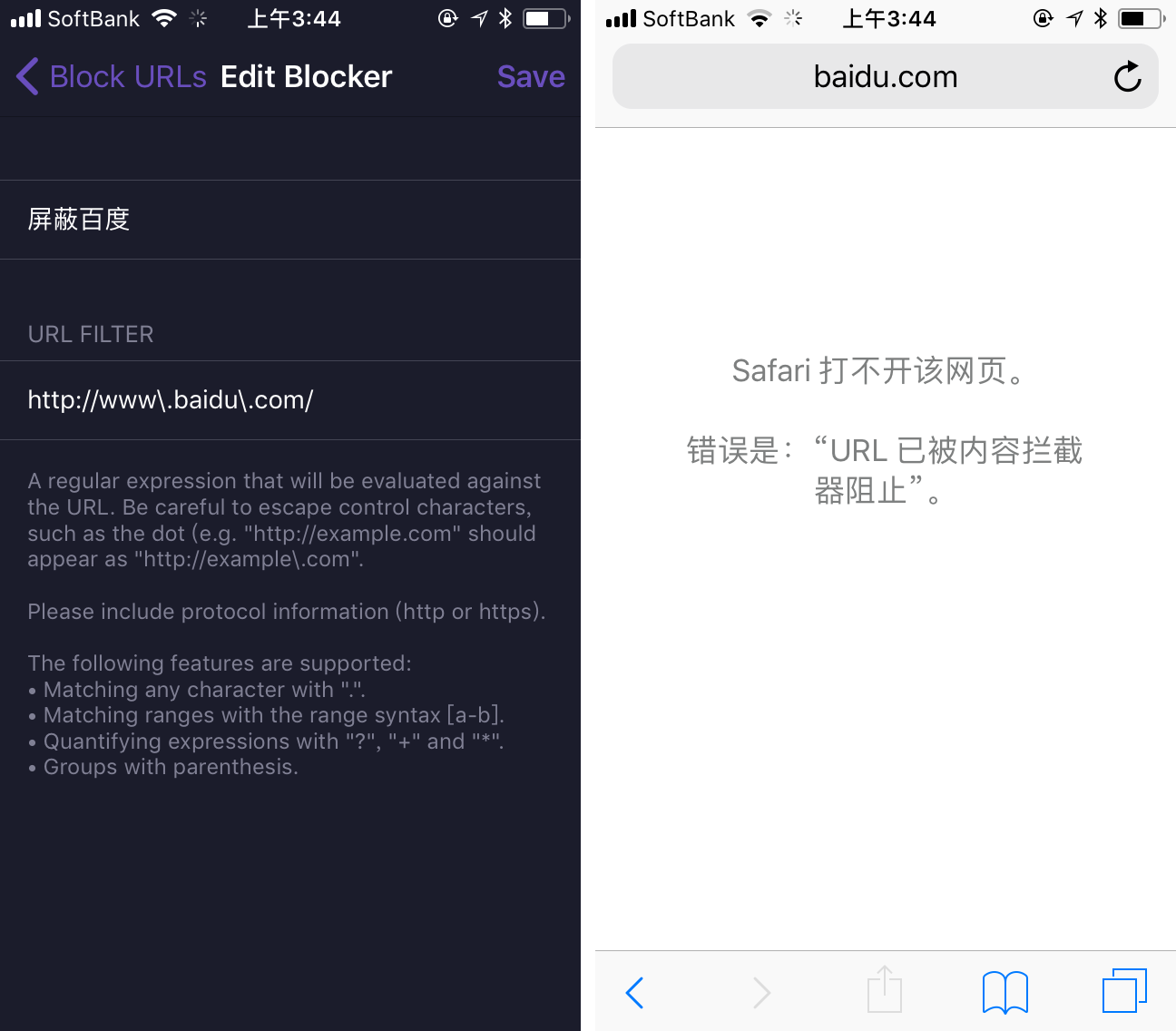 屏蔽访问非常容易理解,它就是直接不让网页加载这个链接下的内容。比如你加了一条 baidu.com 的规则,或者按正则表达式,在 1Blocker 里写规范一点是 http://www \.baidu\.com/,你就无法打开百度了。