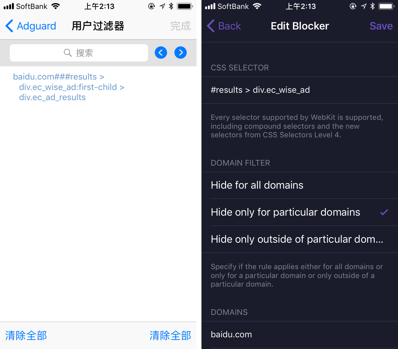 Adguard 中屏蔽元素的规则,一般是这个格式:网页链接 + 两到三个 # + CSS/HTML。比如我们刚才屏蔽的百度广告,它的规则是这样的:baidu.com###results > div.ec_wise_ad:first-child > div.ec_ad_results。
