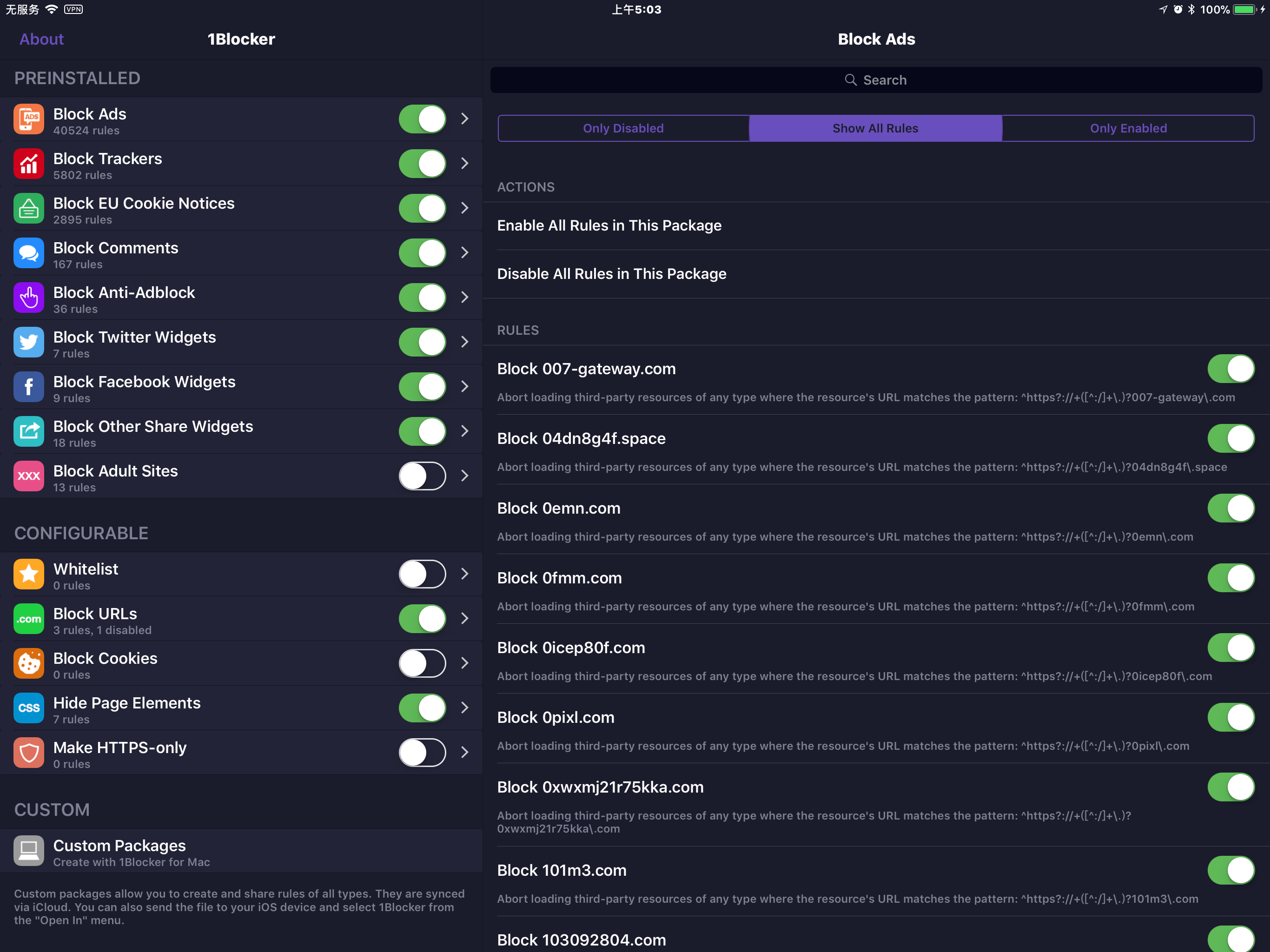 1Blocker 的界面与大多数内容拦截器一样,进来就是开关,对新手很友好,初级用户只要把需要的打开。而当你需要复杂的高级功能,你可以下划到自定义的区域,开始摸索添加自定义的规则。