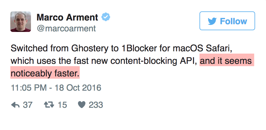 这时候 1Blocker 的强力就体现出来了,它是目前唯一做到 iOS 与 macOS 全平台同步规则的,使用了苹果提供的内容拦截 API 的工具,这大概也是 John Gruber 说用了 1Blocker 以后再也不考虑其它的内容拦截工具的原因了。