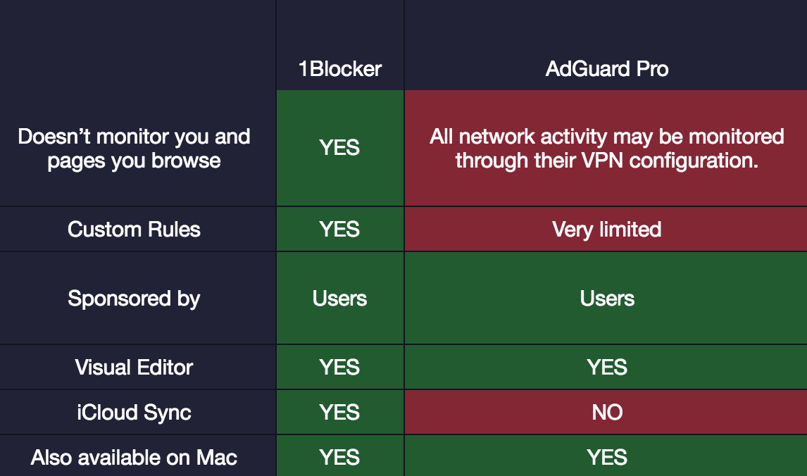 图里 Adguard Pro 可以被坐实的地方只有它不支持 iCloud Sync,像第一行「不监控和记录用户的浏览行为」,1Blocker 也没有证据,所以用了「may be」这样的词。第二行的「自定义规则」,1Blocker 说 Adguard 「Very limited」,实际上我倒觉得 Adguard 的自定义规则更强。