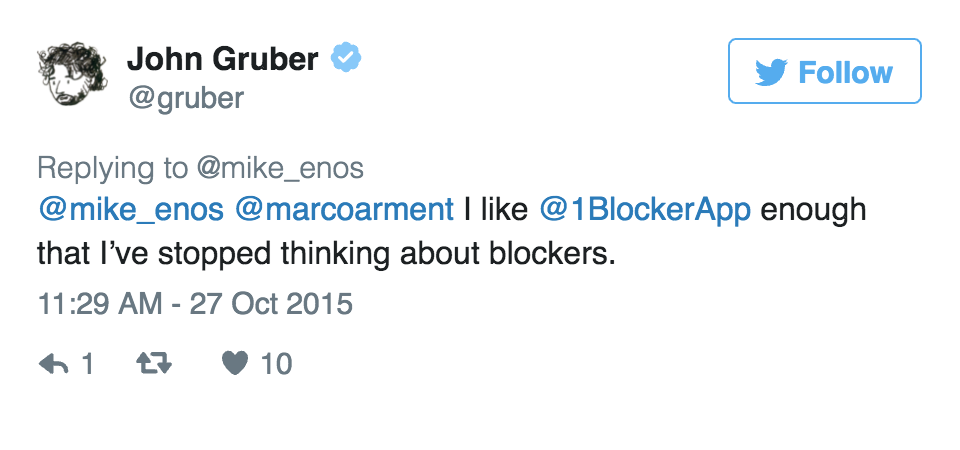 推荐 1Blocker 这个工具,除了它功能出色之外,还有一个原因,就是对这个独立开发团队的认可。