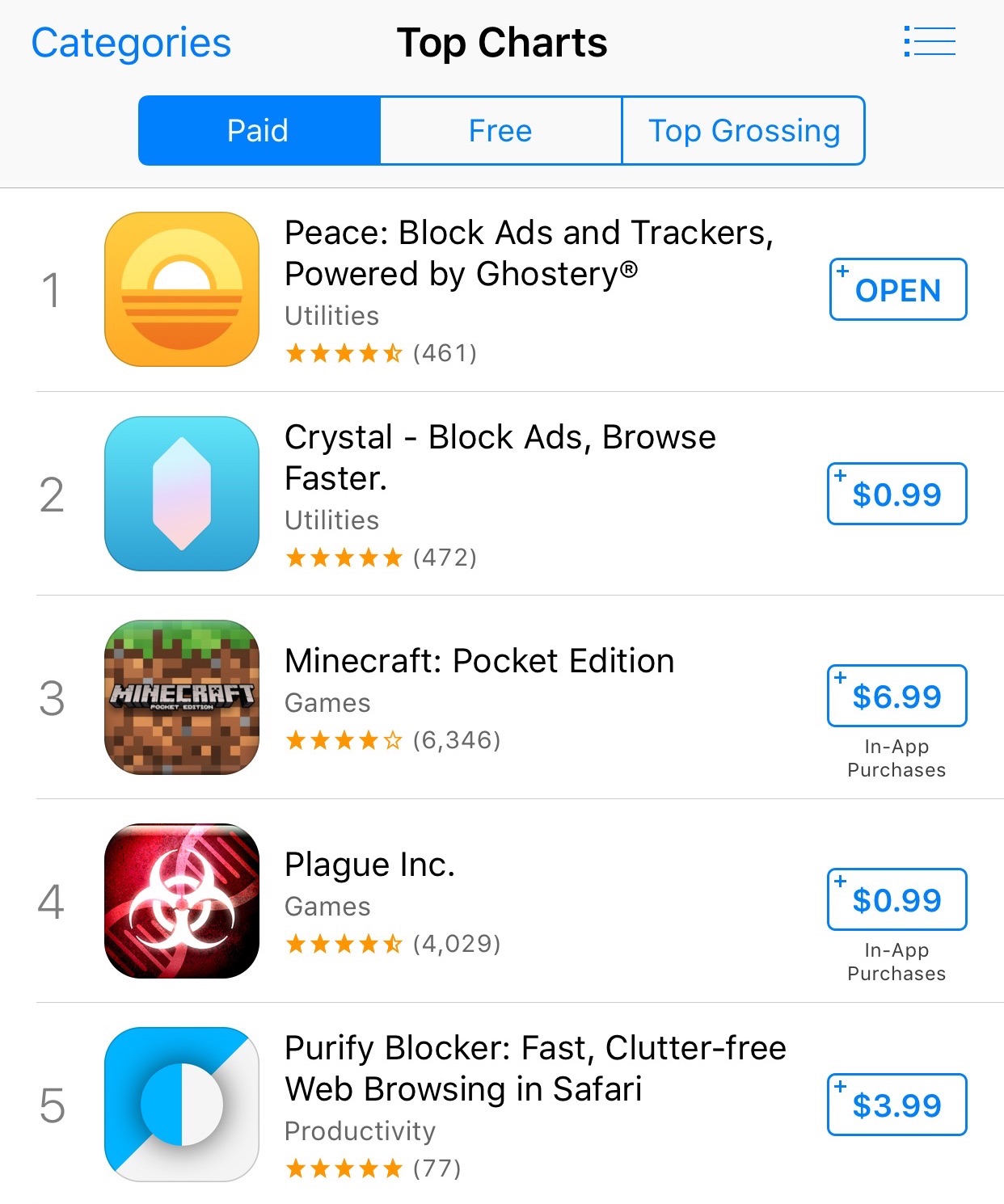 几个月后 iOS 9 正式发布,Marco Arment 随即推出了一款利用这个新技术的工具 Peace 登上了美区付费总榜榜首,成为那个时期 iOS 圈儿最大的热点之一(彼时排名第二的 Crystal、第五的 Purify 同样是同样作用的工具):