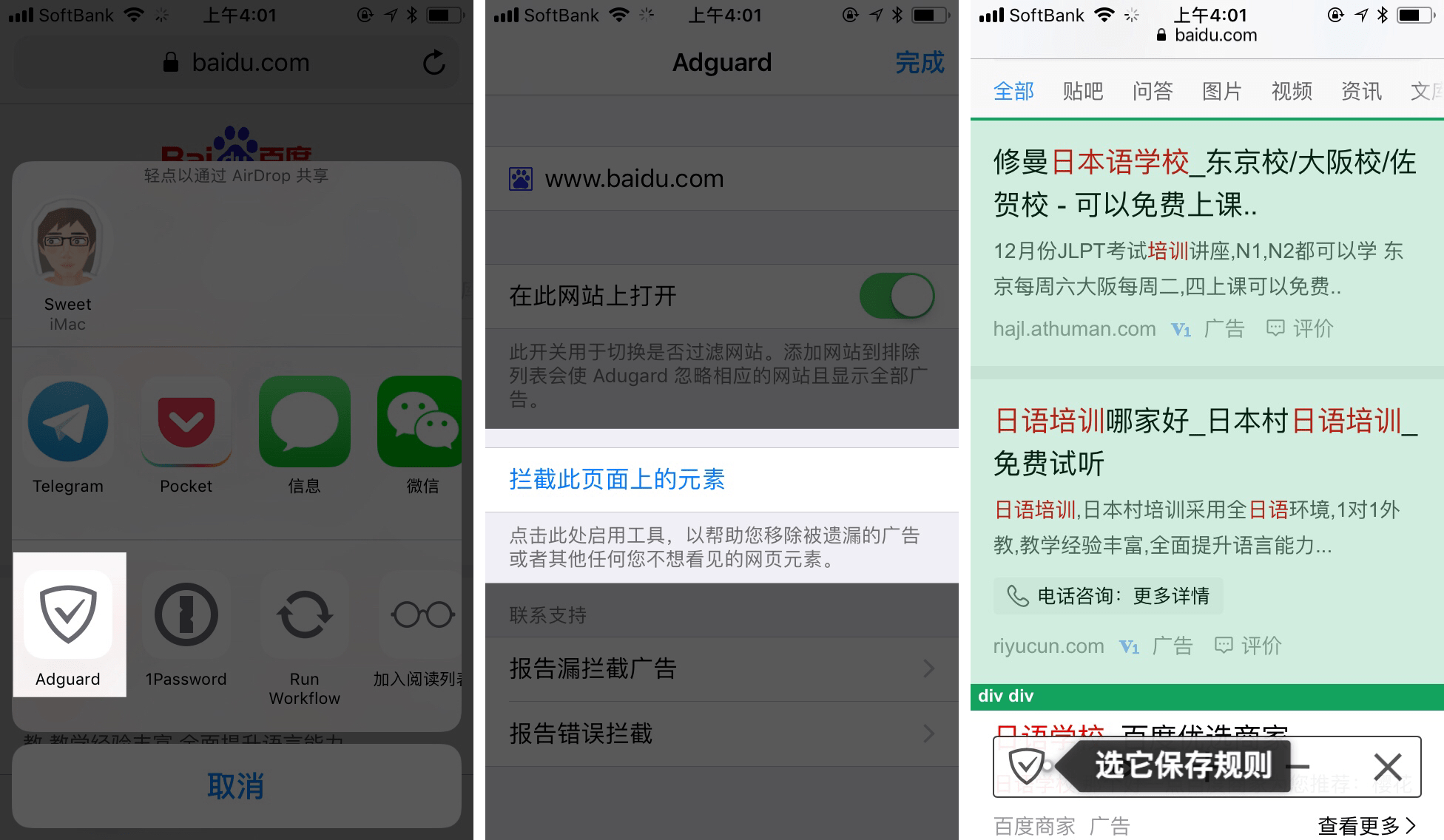 第一步:在 Share Sheet 中找到 Adguard 并打开,选择 拦截此页面上的元素。