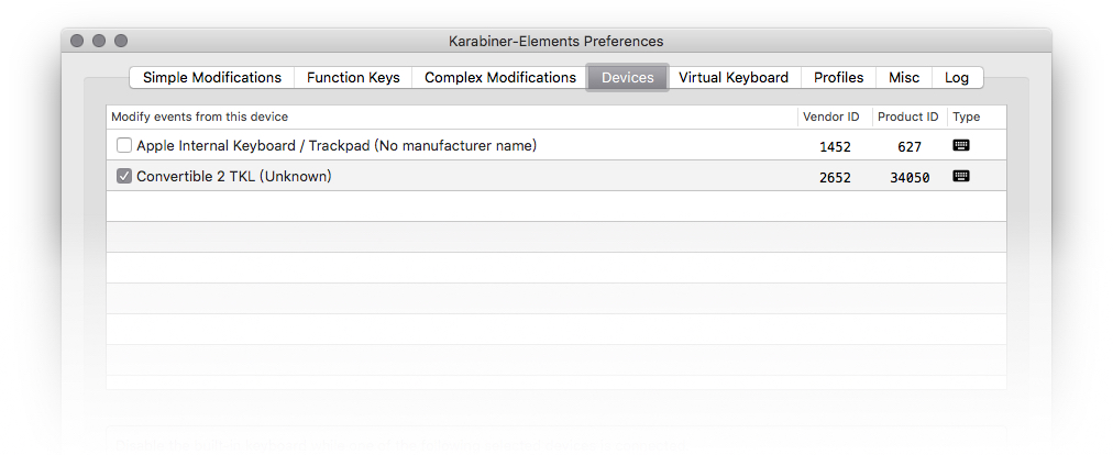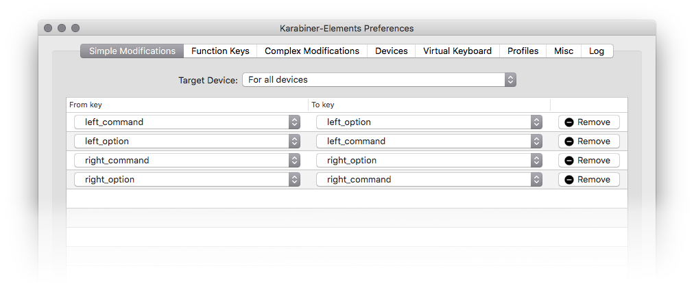 对于 Filco 这种 Windows 键位的键盘,在 Mac 上使用的话,改键是个需要操心的事。虽然听说是有办法从硬件改键位,但为了省事,我选择的是通过 Mac 上的一个开源的改键工具 Karabiner 来改键。具体设置很简单,因为在 Flico 键盘上 option 和 command 键位置是颠倒的,我只需要通过 Karabiner 把位置调换回来,并在 Device 设置为只影响 Flico 键盘即可,这样当我搬走电脑,要使用笔记本键盘的时候,也不会因为改键而影响正常使用。