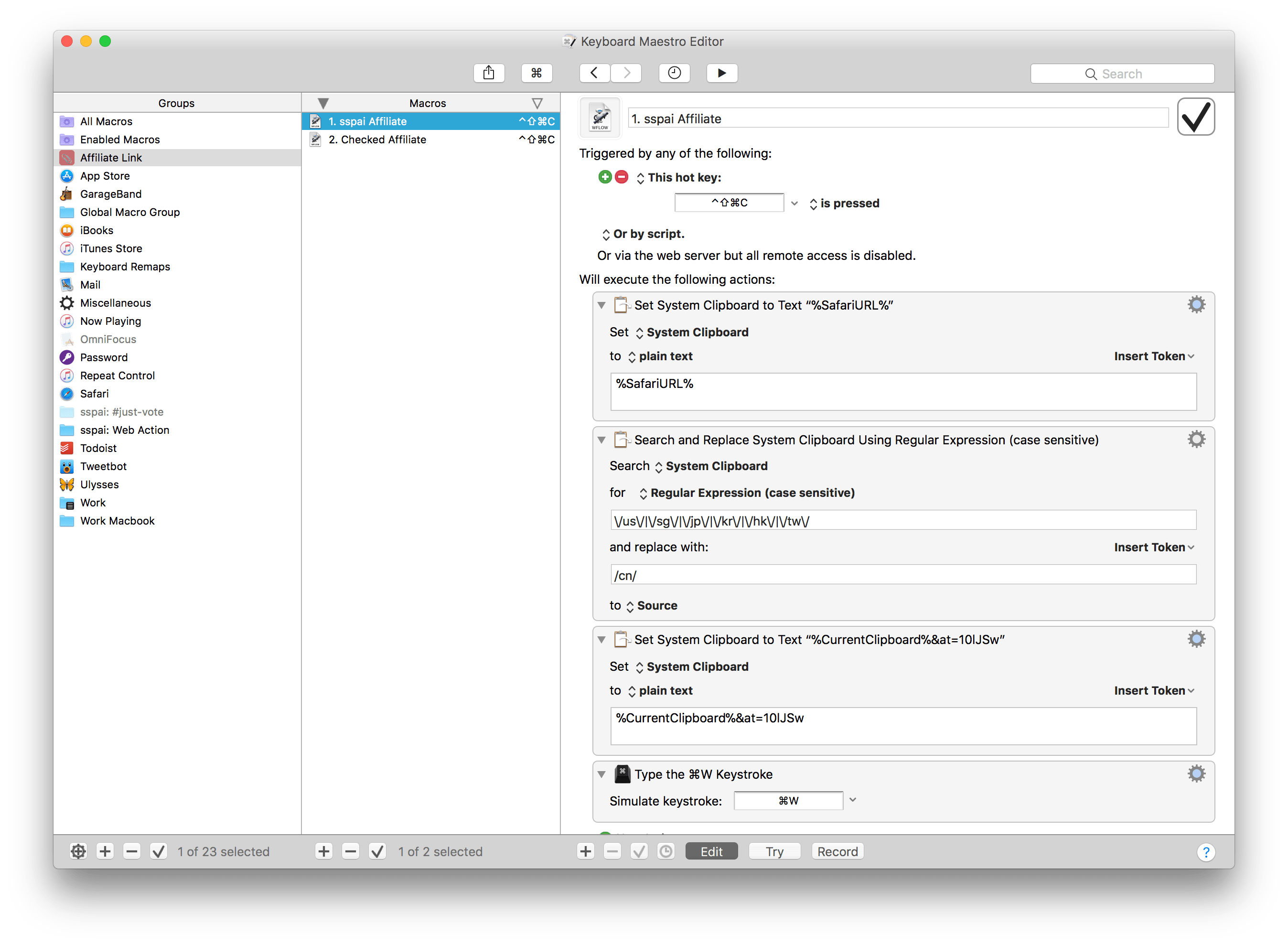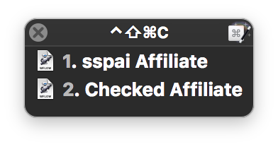 事实上除了在少数派文章里添加返利链接,我也会在我主持的 Checked 播客里添加返利链接。由于每个网站的返利参数都不同,所以需要有两组 Keyboard Maestro 动作来插入。可以看到下面这张图,我将两组动作都设成同样的快捷键,然后在动作名称前加上序号。 这样只需要按下快捷键后,就会弹出一个窗口让我选择要运行哪个动作。