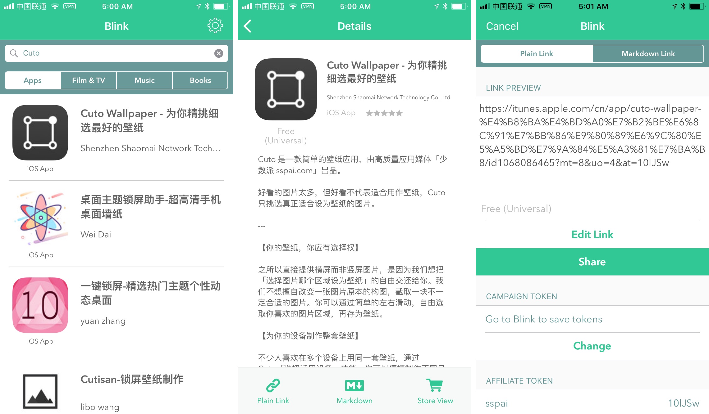 @文刀漢三:我在文章里有简单提到了一句 Blink,这是一个专门设计来添加返利链接的应用。在 Workflow 推出更简单的「App Store 搜索模块」前,Blink 是最简单的方法。因为在这之前,使用 Workflow 搜索 App Store 需要调用 API,整串动作做下来非常繁琐,不是一般的用户能够应付的。在 Workflow 的 1.5 版本更新时,它将整套复杂的 API 调用整合成两个简单的模块,一个用于搜索,一个用于获取内容,使用起来方便很多。 当然如果仍然要比较的话,Blink 还是更简单,它整套流程都是提前设计好的,你只需要调整几个开关,填一两个参数就行了。