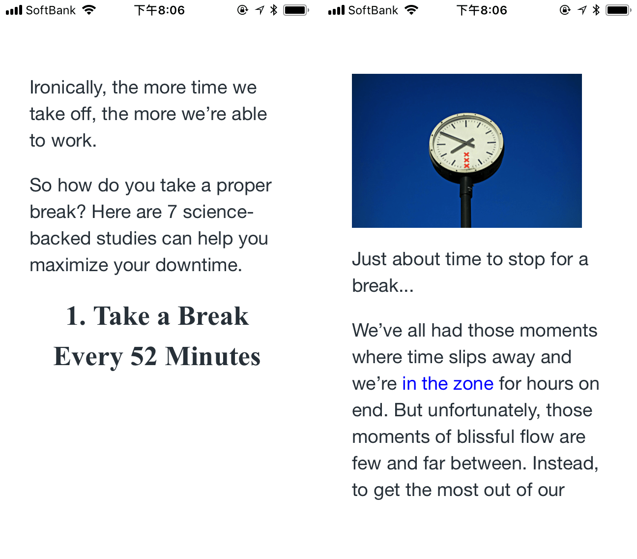 在扒网页这个需求上,必须要考虑的一点是在 iPhone 端的表现如何。单纯地把网页生成 PDF 存下来,在 iPhone 上阅读就会非常辛苦。特别是在 iPhone 上我们更适合滚动的浏览方式,而不会习惯翻页的 PDF 以及因为翻页而出现的排版问题:
