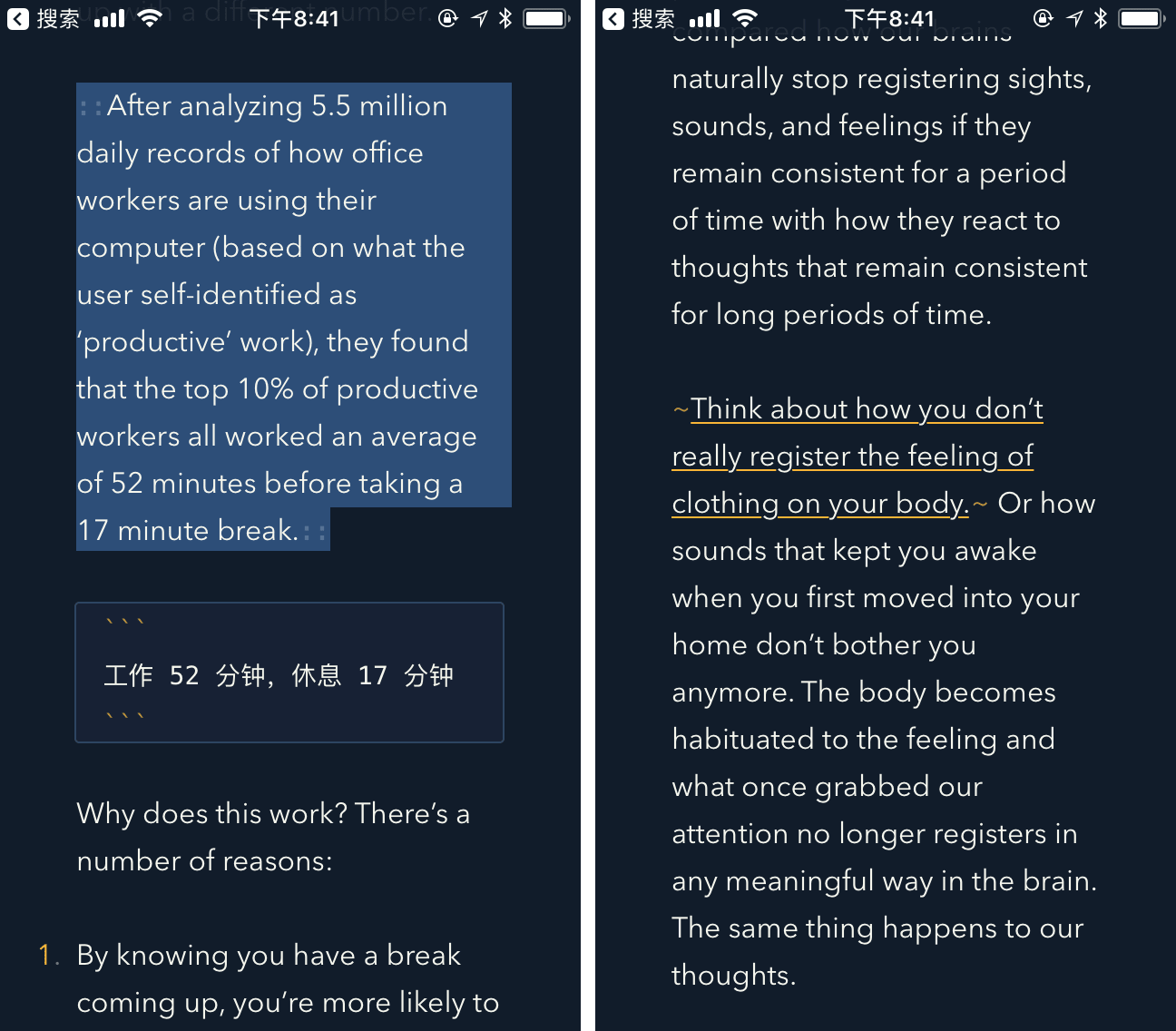 这些大概就是我们阅读在线文章这种「不轻不重」的文章时基本的批注需求了。如果有更进一步的需求的话,首先 iPhone 可能就不适合了,这时候也自然会有更适合的工具和流程。