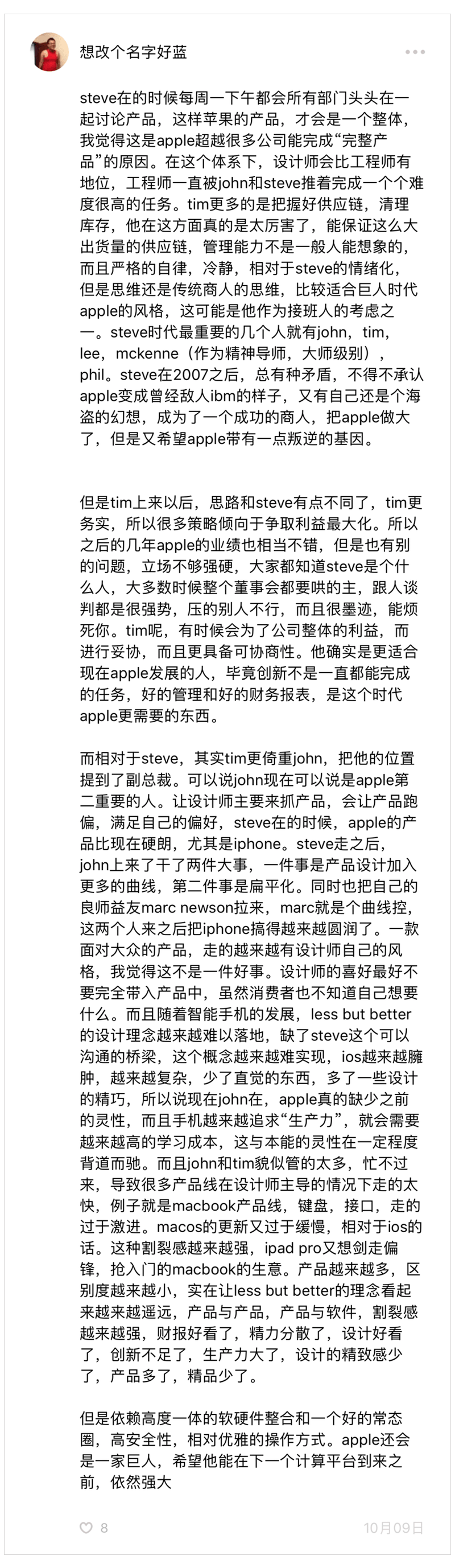 对于 Marco 在 Twitter 发起的讨论,我们在预告文章中引出了多个话题,包括「键盘体验」「前后乔布斯时代」等等,还是发现大家对后者谈论的欲望比较强烈。其中 @想改个名字好蓝 这位看口音就知道来自南方的朋友,看起来对苹果的这些事比较了解,希望你给大家分享一下相关读物。