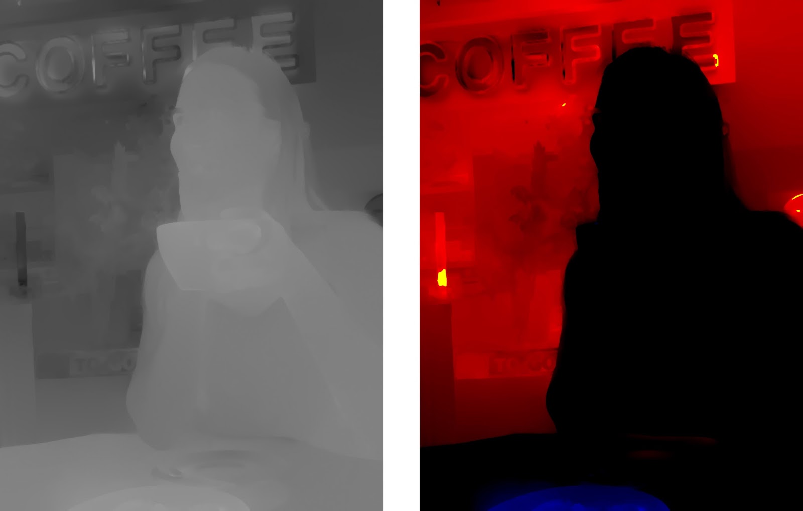 在上图左侧的景深映射图中,颜色越浅意味着距离拍摄者越近;右侧 Pixel 2 将这种远近关系进一步「可视化」——黑色区域无需虚化、蓝色区域被识别为前景、红色区域则会根据颜色深浅程度给予不同程度的虚化效果。