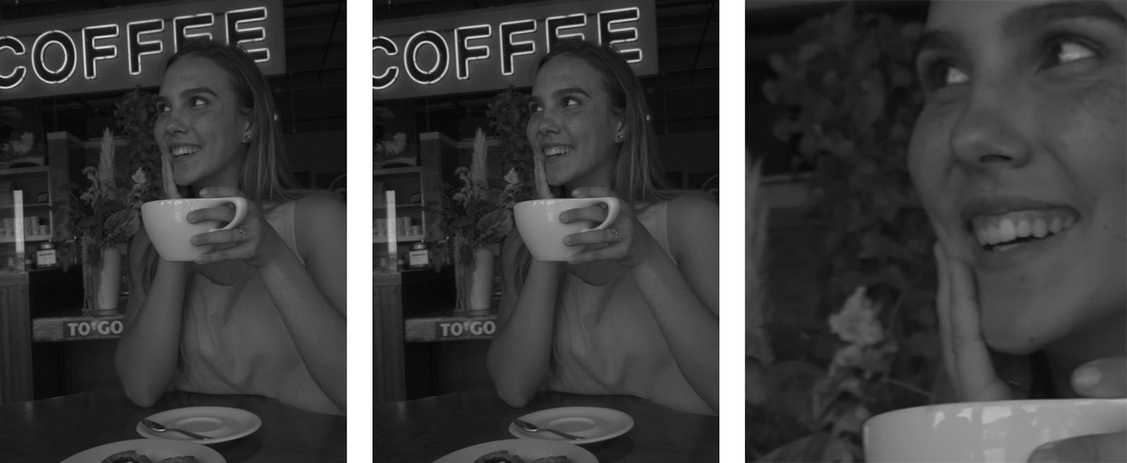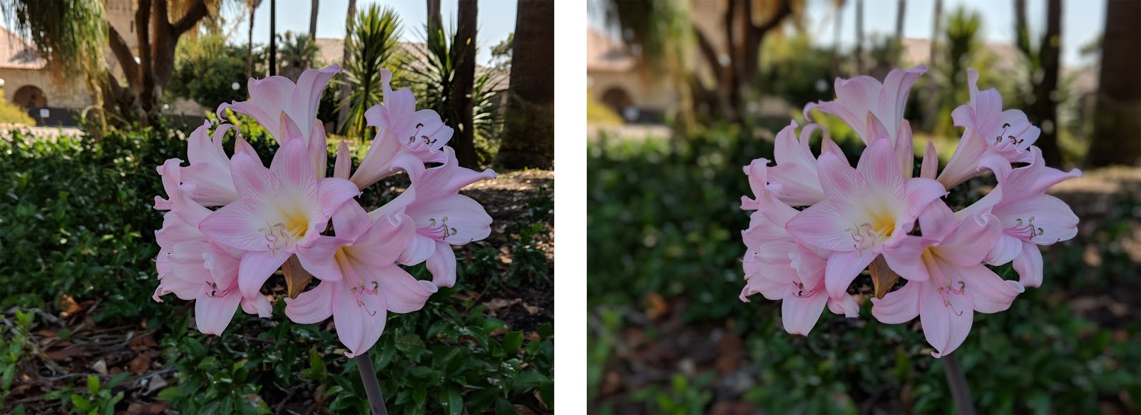 在下面的例子中,Pixel 2 的双像素传感器就分别从上、下两个位置捕捉到了两张看似相同的照片,但如果你仔细观察最右的对比动图,就会发现同一个像素传感器上的上、下两部分捕捉到了细节略有差别的照片!