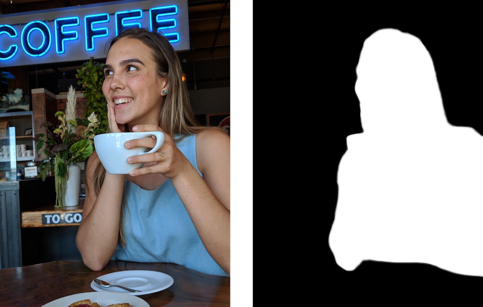 这就是电影产业中常用的色键抠像(chroma keying),虽然很高效,但显然不能用在手机上进行图像分割。在这里,Google 引入了自家特长——机器学习。