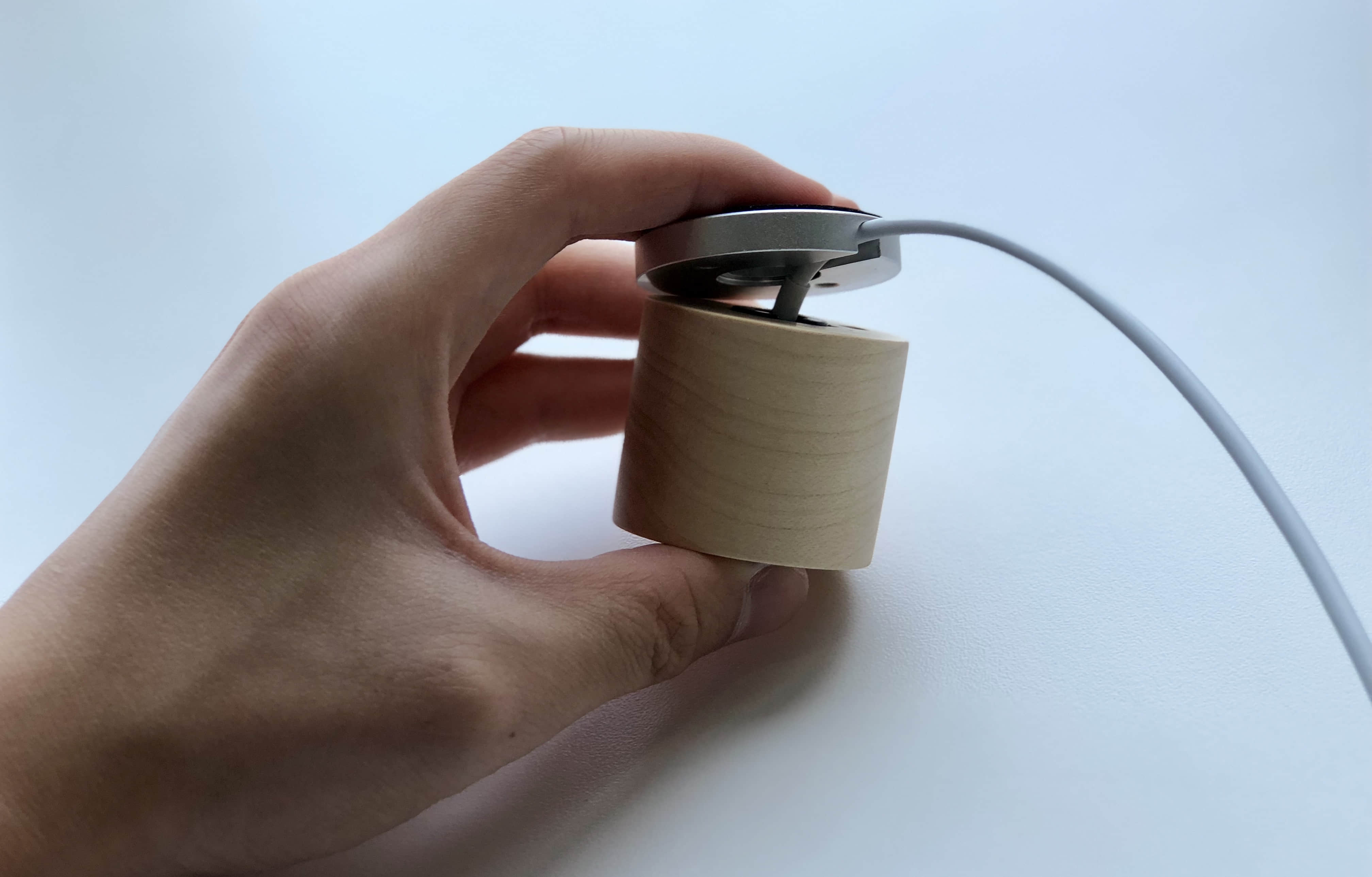 底座表面有两个孔,一个是充电用,需要用到 Apple Pencil 包装盒里附带的转接口。另一个孔可以让你在充电时放笔盖,不过要注意,笔盖轻轻放上面就好了,不然容易塞太紧拿不出来,此外也可以将笔尖朝下倒着放。