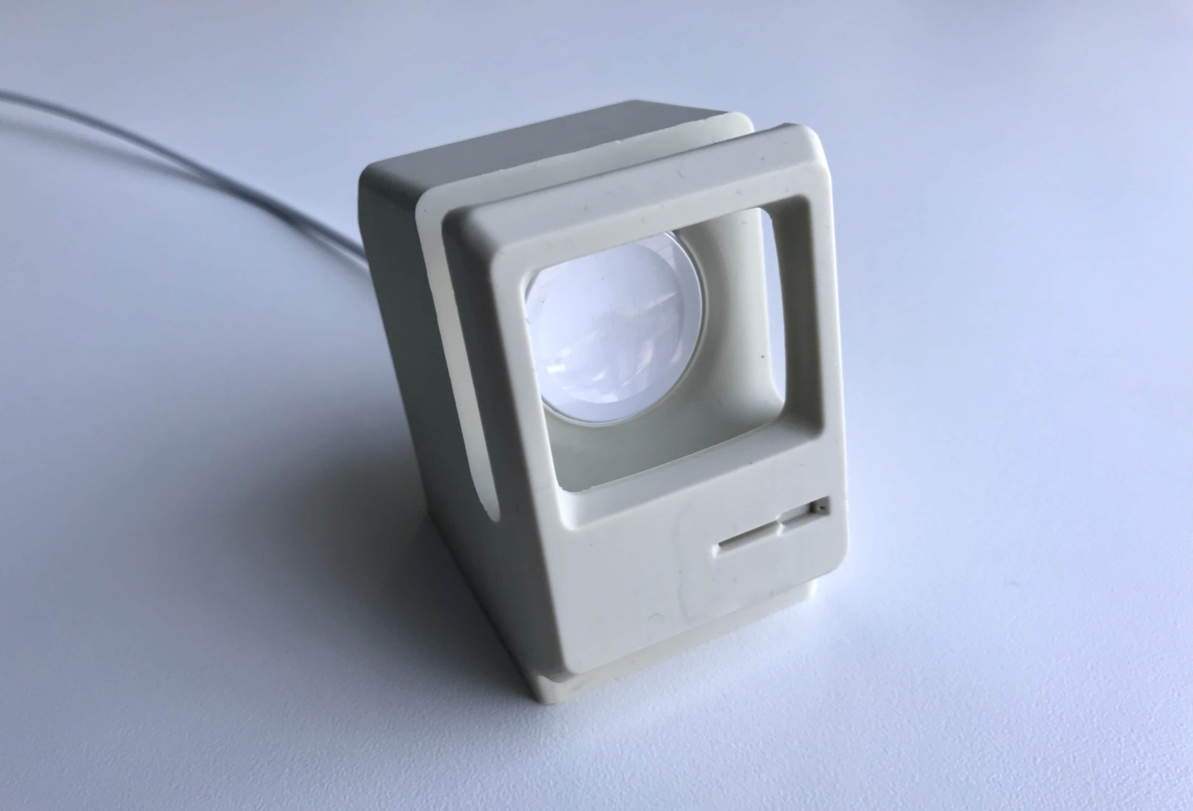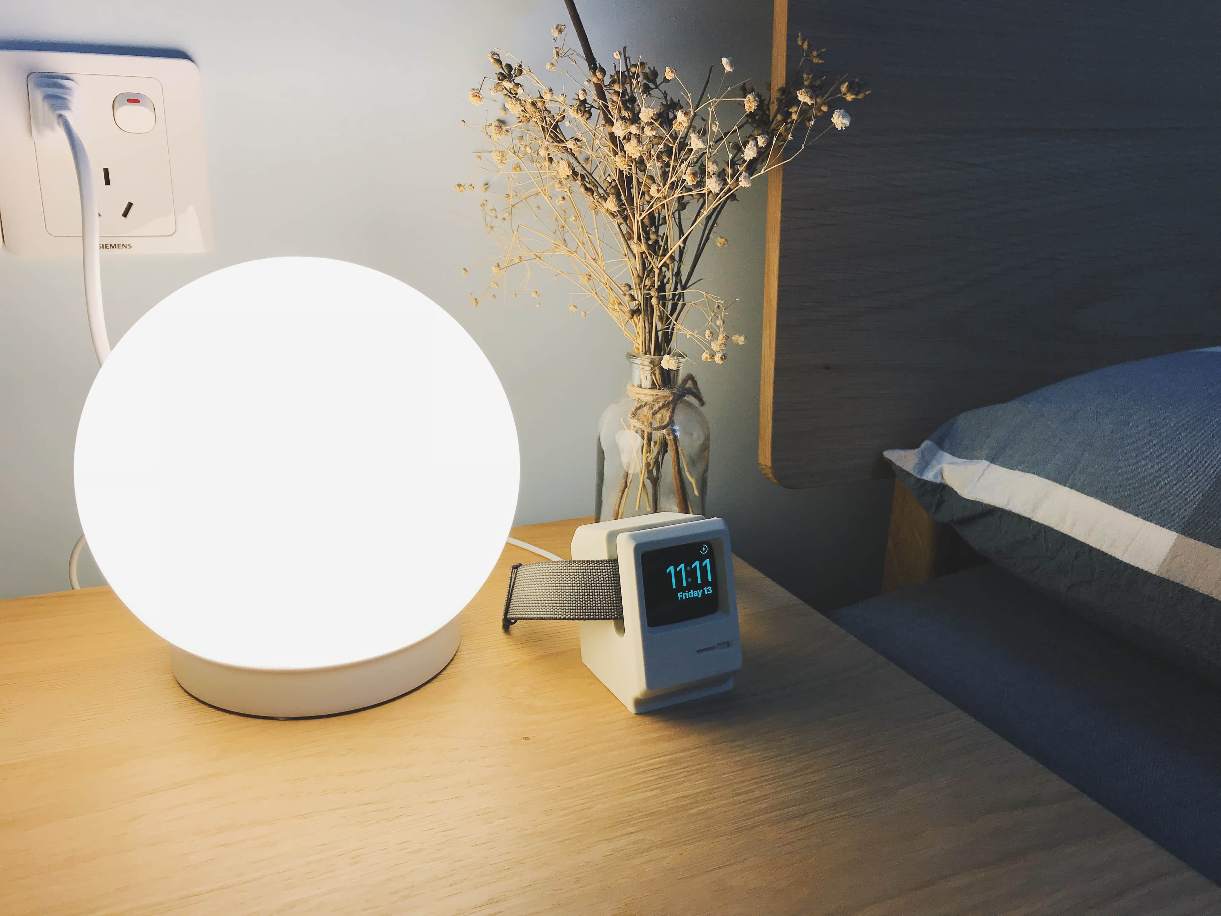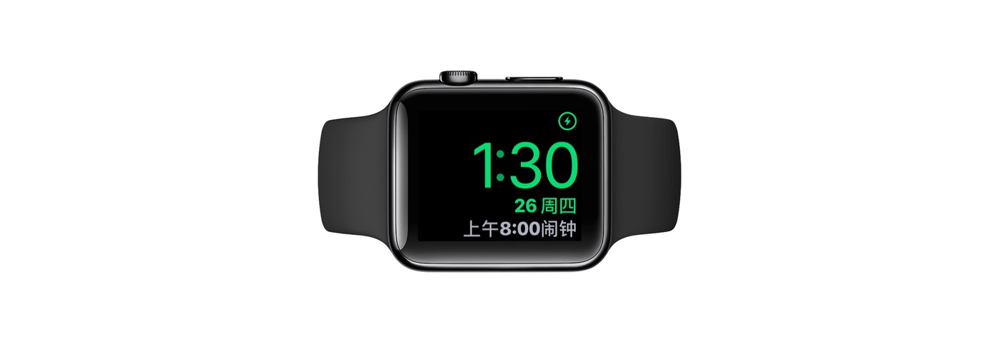 我打算先从 Apple Watch 的充电线开始搞起。手表充电线其实还好,不算丑,但也绝对算不上很好看。elago 的这款 Apple Watch 底座我相信很多人都在社交网络看过图片,模仿了初代 Macintosh 电脑的造型,配合 Apple Watch 的显示屏,看起来非常复古。 另外这个底座还能配合 Apple Watch 的床头钟模式使用,当你将 Apple Watch 充电且侧放时,就会自动进入床头钟模式,显示屏会变成下图这样的状态。 床头钟模式并不会一直亮着屏幕显示时间,而是需要你伸手去戳一下屏幕或者按一下按钮才会显示。另外还有一个有意思的显示时间的方法,就是敲一下你的桌子,Apple Watch 感受到轻微的震动了,也会显示时间。