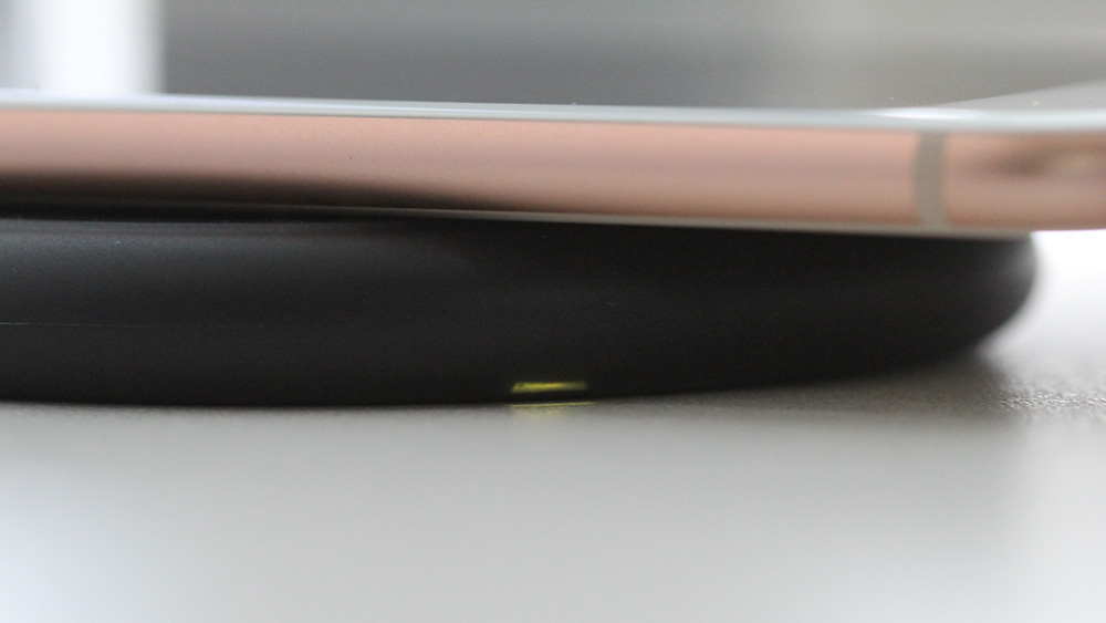首次试用的充电体验也很理想,接通电源,把 iPhone 8 放在上面立刻就能开始充电,虽然有距离限制,但戴手机壳并不影响充电,即使是很厚的防摔手机壳,只要不是金属材质,放在上面都能正常充电。