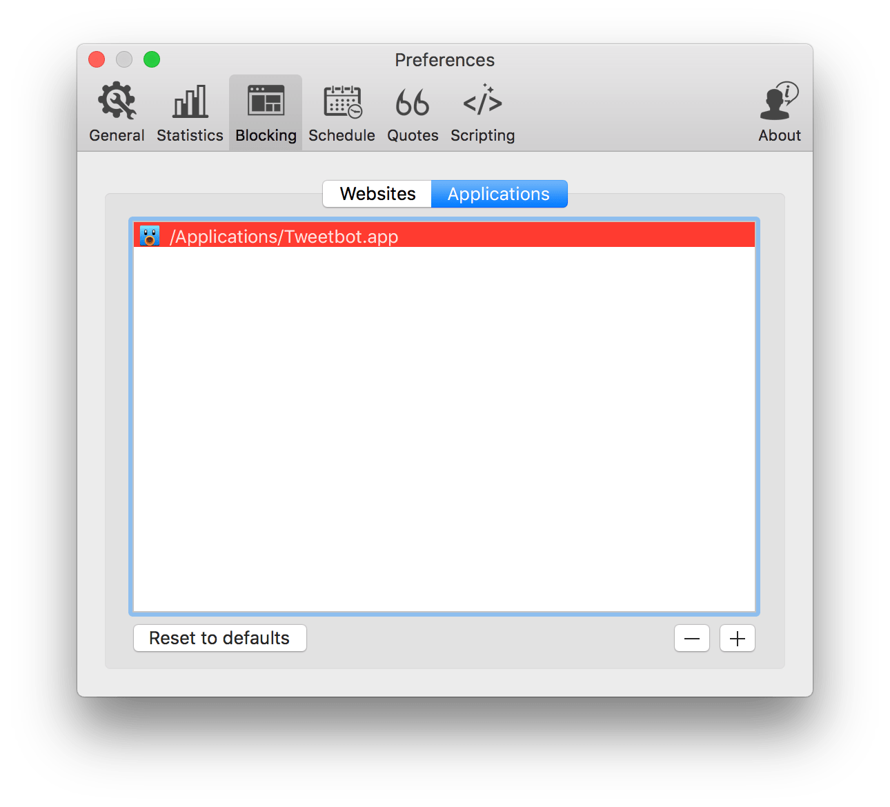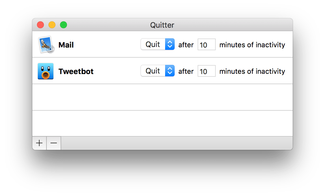 Quitter 是 Marco Arment 的作品,在写这个免费的小工具之前,Marco 就有一个脚本用来帮他自动退出一些社交软件。Quitter 的工作方式很简单:我们可以设定,10 分钟后如果没有使用某个软件,就将其退出或隐藏。 这是个很好地轻量自我束缚的方式,在停止使用 10 分钟后自动退出邮件客户端和社交客户端,可以在需要全神贯注的工作时间减少通知的干扰。
