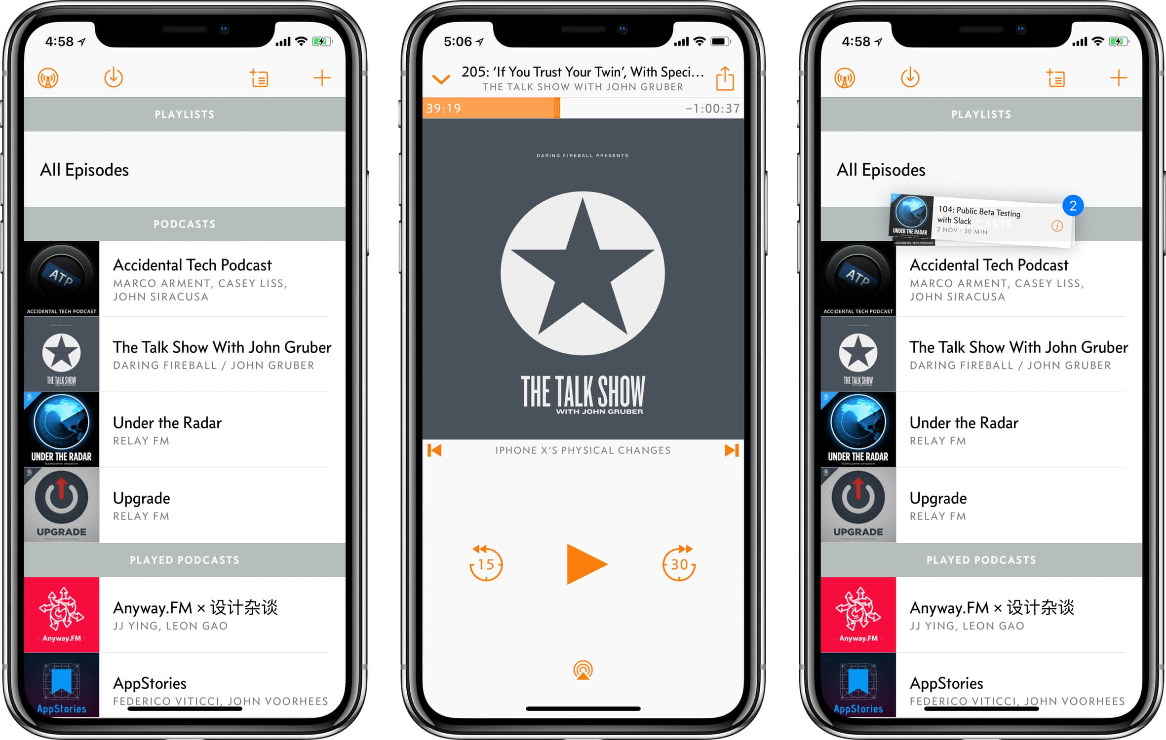 知名开发者 Marco Arment 开发的播客客户端,主打两个特色功能 Smart Speed 和 Voice Boost,前者可以智能缩短节目的沉默时间,后者可以均衡节目的音量。