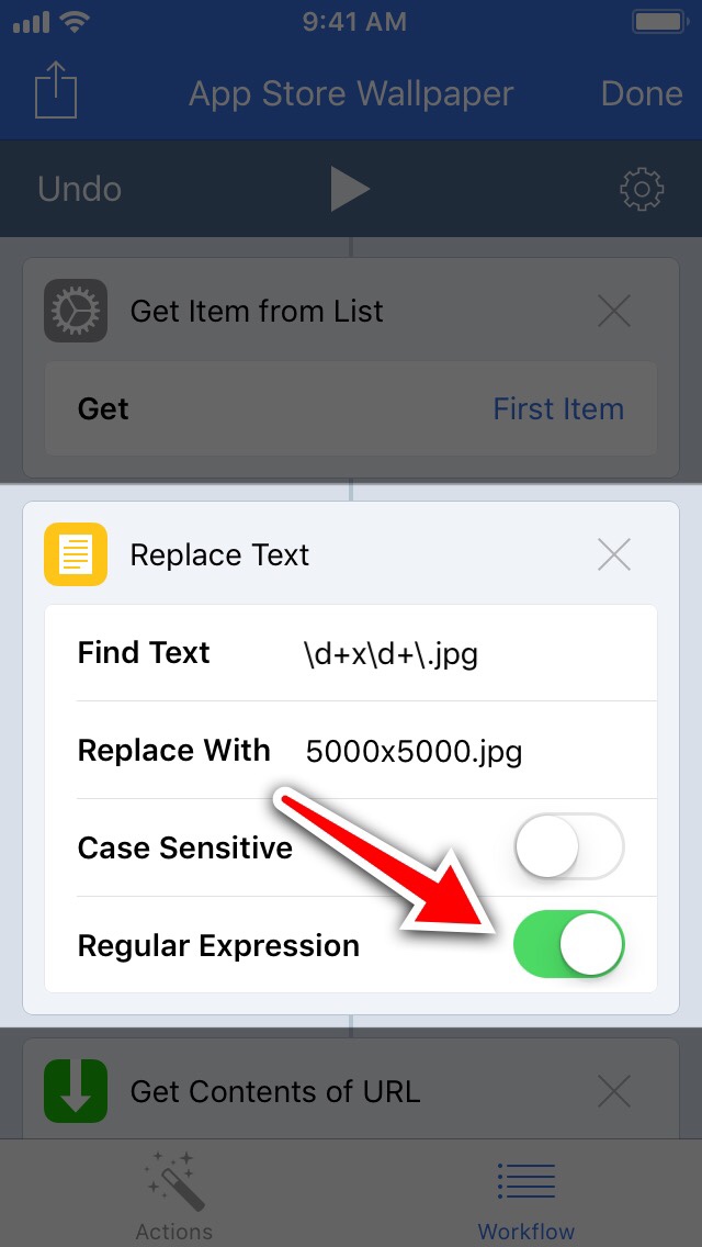 这里使用 Replace Text 动作加上正则表达式来查找并替换链接中的分辨率参数,为了获取最大的分辨率,本例中将参数设置成了 5000x5000(最终实际下载的图片还是 4K 分辨率的)。