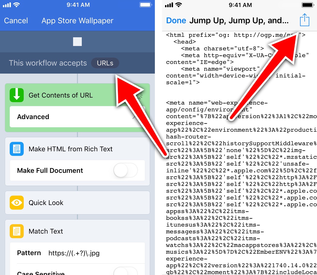 这里需要用到 Get Contents of URL 将网页下载下来,并通过 Make HTML from Rich Text 把网页转换成 HTML 文档,通过查找 HTML 文档中的相应字段,来获取特定资源的下载链接。直接通过 Quick Look 来阅读 HTML 文档太麻烦了,可以考虑将文档发送到电脑上,使用专门的编辑器来阅读、查找,会方便很多。