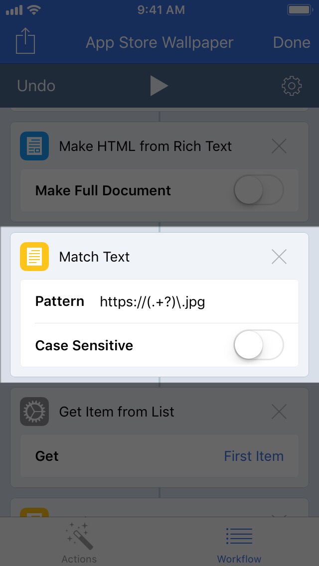 前文中查找到的图片链接都是 https://abcde12345.jpg 这种格式的,使用 Match Text 动作配合简单的正则表达式就能将所有这类型的链接抓取出来。这里用到的正则表达式是 https://(.+?)\.jpg, 其中的关键部分在于小括号中包含的内容。