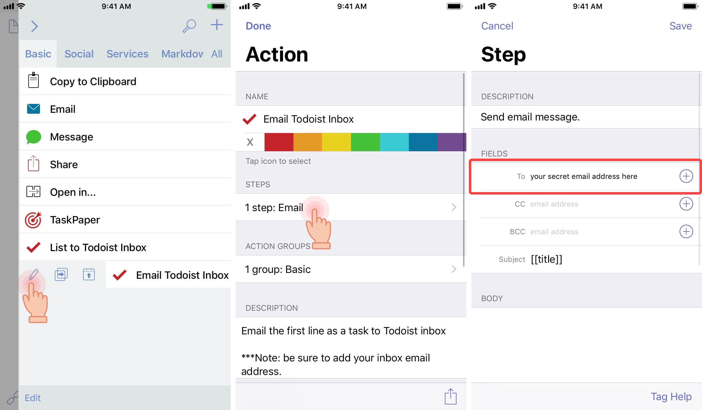 在「Email Todoist Inbox」这个动作里面,将 Todoist 的邮箱地址填进去。