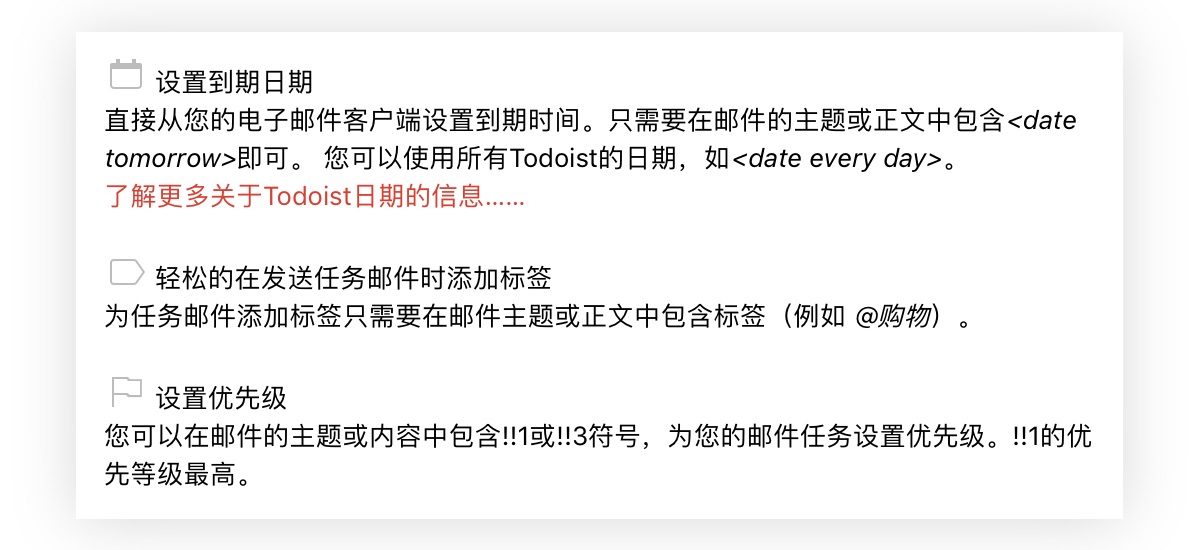 每行文本会保存为一个任务,你也可以为每个任务都加上一些属性,比如截止日期、标签、紧急程度,具体可以参考邮箱地址页的说明。