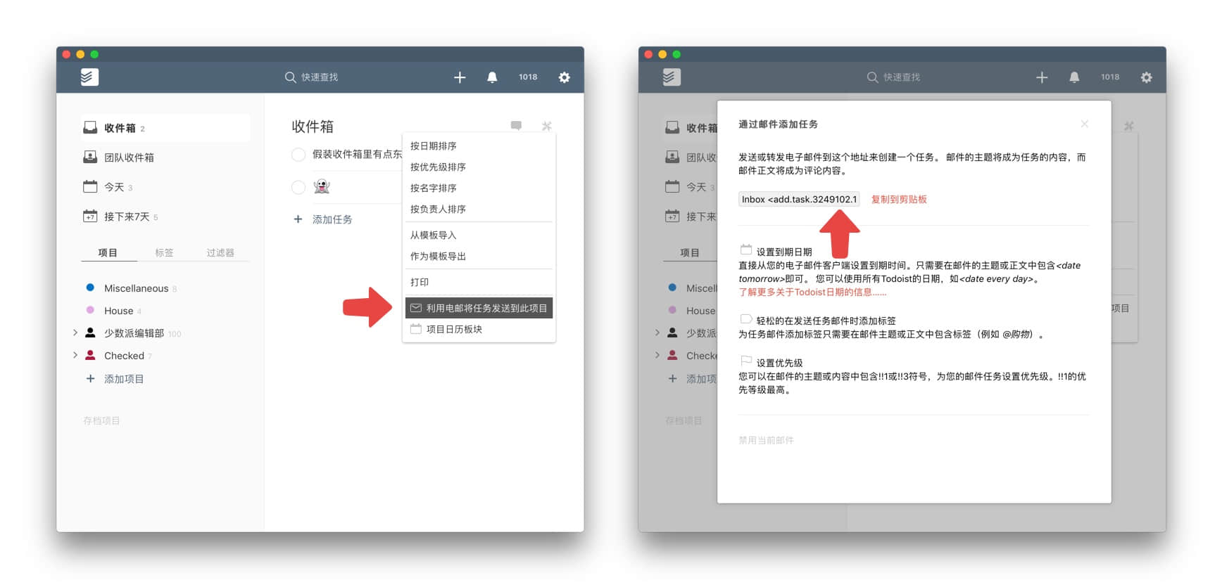 首先你需要到网页版或者桌面版的 Todoist 中,在 Inbox 右上角的工具栏里找到 Todoist 的邮箱地址(每个项目都有单独的邮箱地址),注意保存好这个邮箱地址,不要发布到公共场合上。