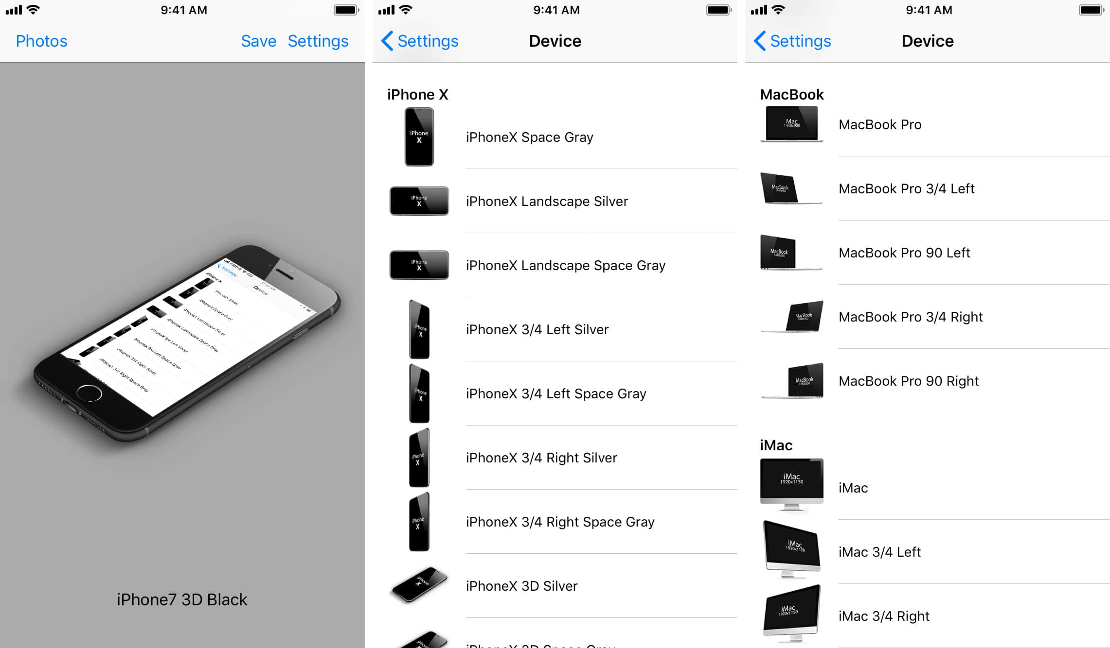 一款比较老牌的带壳截图工具,支持的设备型号丰富,甚至还包括 Apple Watch、iMac、MacBook 等设备。每款机型都有多个透视角度可选择,导出设置选项也比较丰富。应用本身免费,但每天只能保存 2 张图片,付 30 元可解锁保存次数限制。