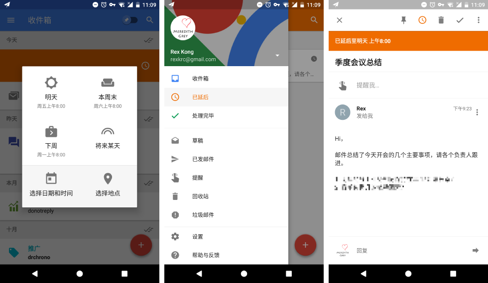现代邮箱服务一般都具备了延后(Snooze)功能,在 Inbox 中,右滑一封邮件,就可以触发延后功能。一旦延后了某一封邮件,它们就会从「收件箱」列表暂时迁移到「已延后」列表,只有当设定的时间点到来时,它们才会自动回到收件箱。
