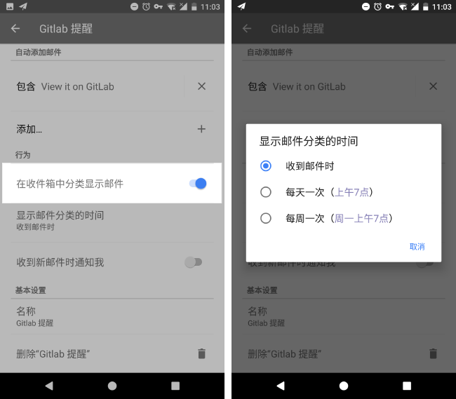 其次,你可以自定义这些分类。Inbox 默认提供了行程、购物、财务、社交等分类,在这个基础上,我也可以将任意标签,设置为「在收件箱中分类显示邮件」。例如,我可以将所有 Gitlab 提醒的邮件放入相应的标签,并在收件箱中只展示一个汇总,点击到二级页面才能查看所有相关的邮件。最棒的是,我甚至还可以定义显示邮件分类的时间,与其每次收到新邮箱都出现,你有选择让它们每天或每周只出现一次。遗憾的是,这个出现的时间点,目前还不支持自定义。