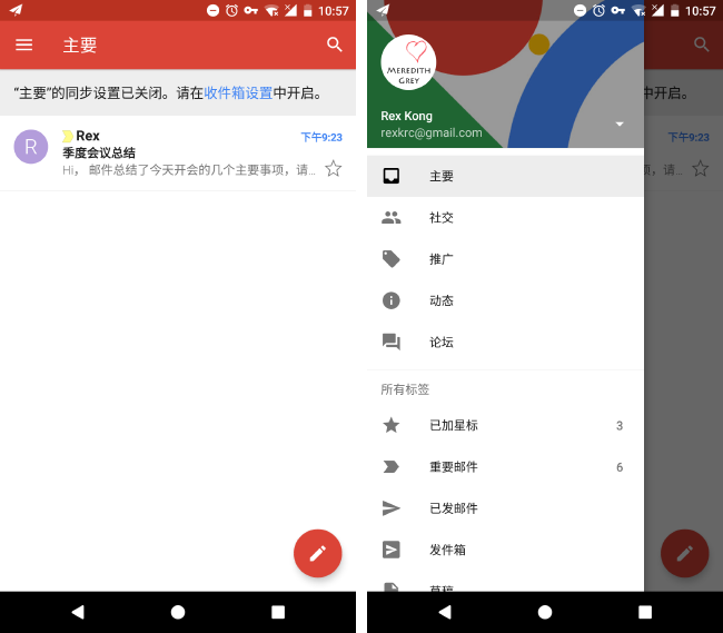 而在手机端的 Gmail 中,「主要」这个类别则成为了事实意义上的「收件箱」,你需要在左滑菜单中,才能进入其余四个类别,在表现形式和实际意义上,都与标签无异了。